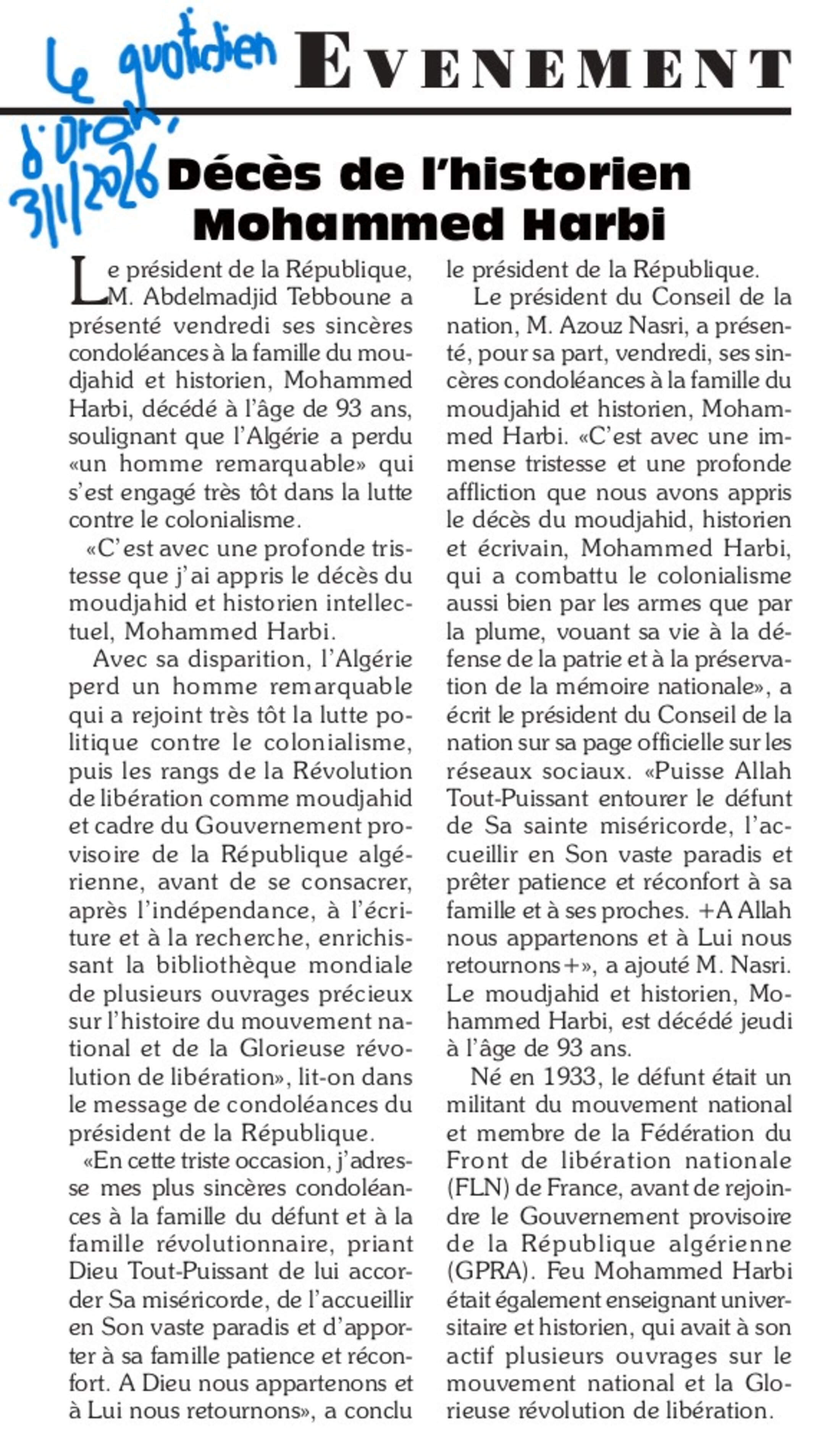 https://blogs.mediapart.fr/histoire-coloniale-et-postcoloniale/blog/040126/memoriam-mohammed-harbi-1933-2026