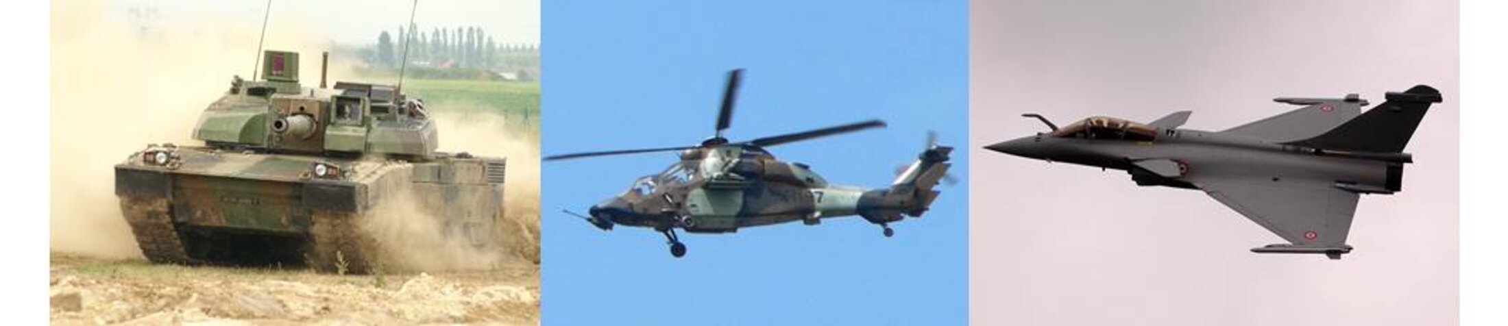 Photos : char Leclerc, hélicoptère Tigre, avion Rafale. © Wikipedia