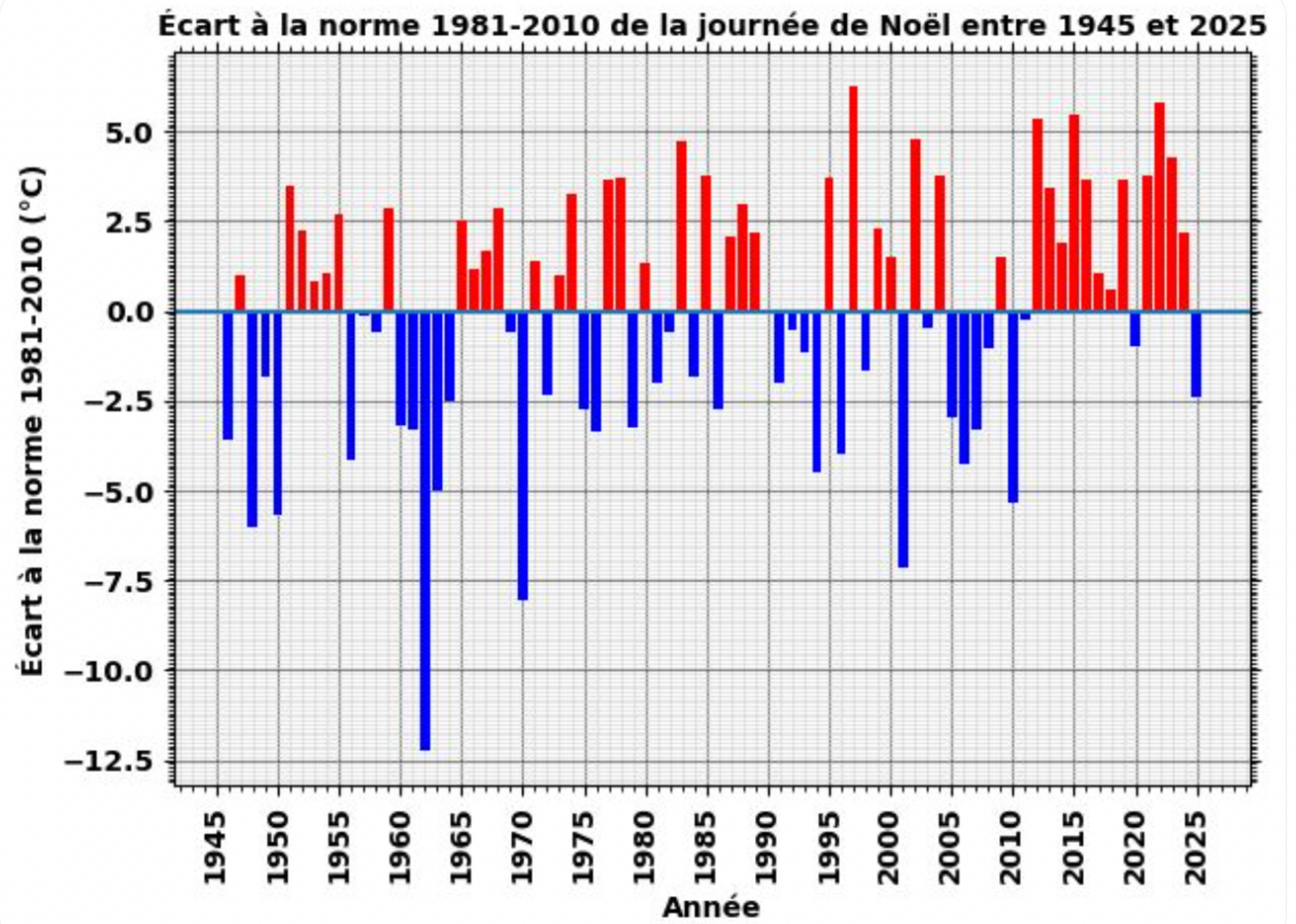 C'est un titre accrocheur, sans nuance, focalisé sur le froid, qui laisse croire à un événement exceptionnel. Mais celui-ci masque totalement la dynamique des 15 dernières années, dominées par des Noël largement plus doux que la normale. Elle banalise l’évolution de fond.