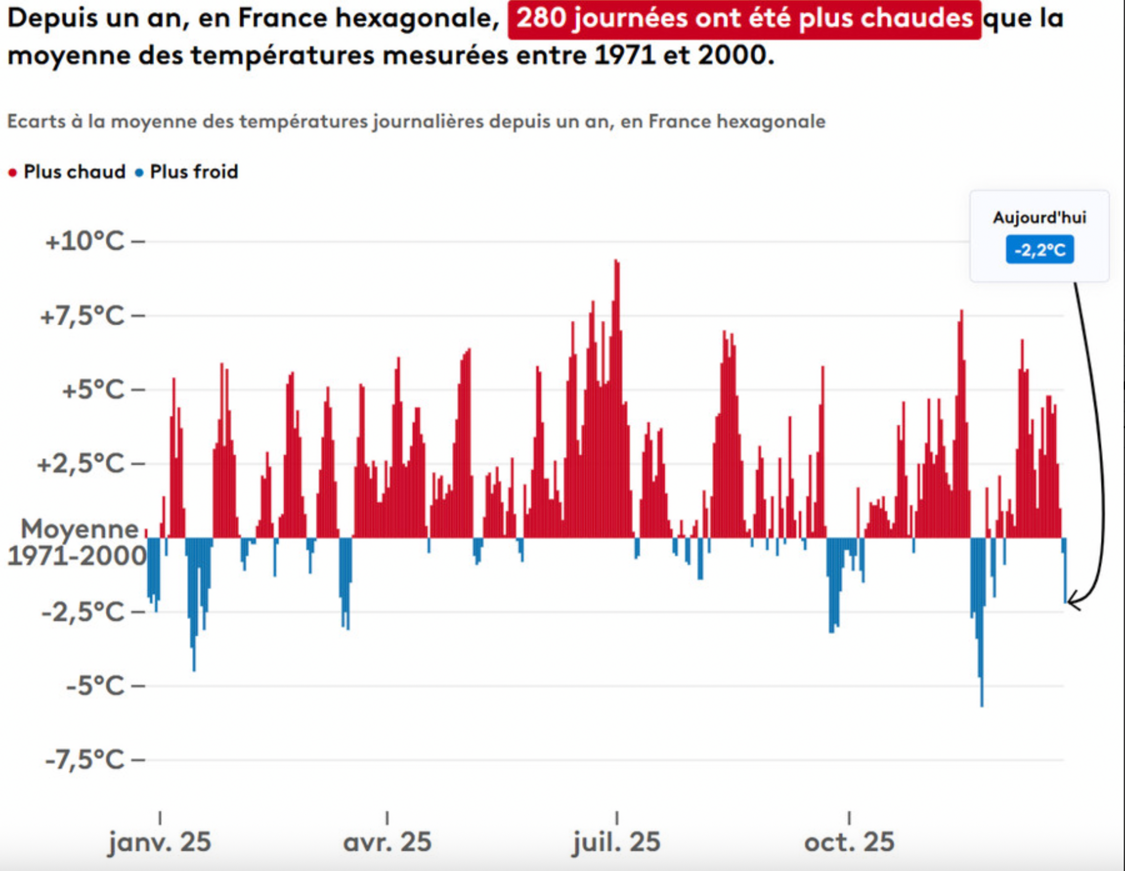 Le vrai sujet n’est pas qu’il ait fait froid un jour de décembre. Le vrai sujet, c’est que cela fait désormais événement (alors qu’avant les années 2000, ce type de température à Noël était courant, parfois une année sur deux !).