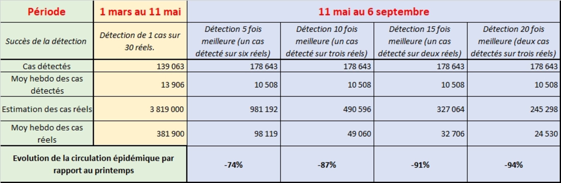 Entre le début de l’épidémie et le 6 septembre, la France a détecté 317 706 cas positifs, c’est-à-dire… pas grand-chose ! En effet, même en adoptant les conclusions extrêmement prudentielles de l’Institut Pasteur (https://hal.archives-ouvertes.fr/hal-02914300/document), près de 4 millions de personnes avaient été contaminées à début mai. Ainsi, on constate :