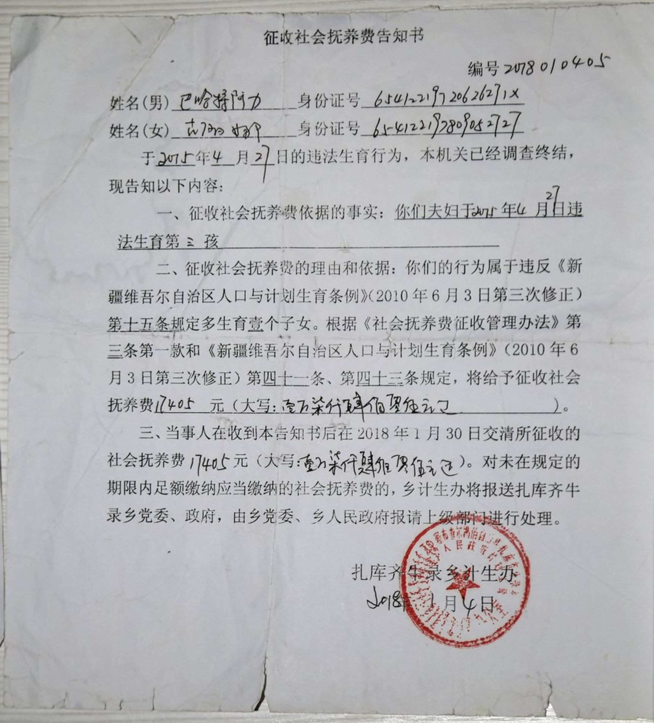 En 2017, le gouvernement du Xinjiang a également triplé les amendes déjà élevées pour violation des lois sur le planning familial, même pour les résidents les plus pauvres, pour atteindre au moins trois fois le revenu annuel disponible du comté. Si les amendes s'appliquent également aux Chinois Han, seules les minorités sont envoyées dans les camps de détention si elles ne peuvent pas payer, selon les entretiens et les données. Les rapports du gouvernement montrent que les comtés perçoivent chaque année des millions de dollars grâce aux amendes.