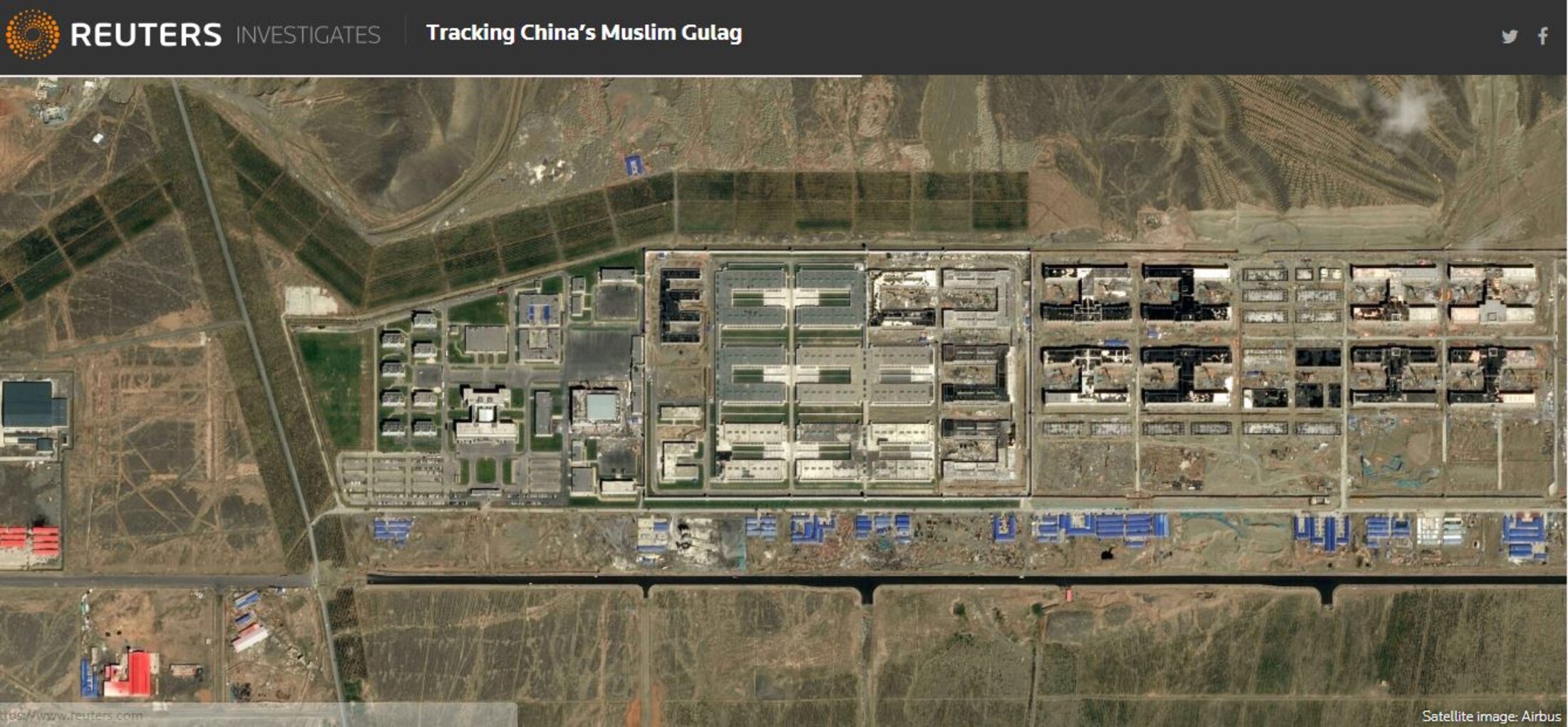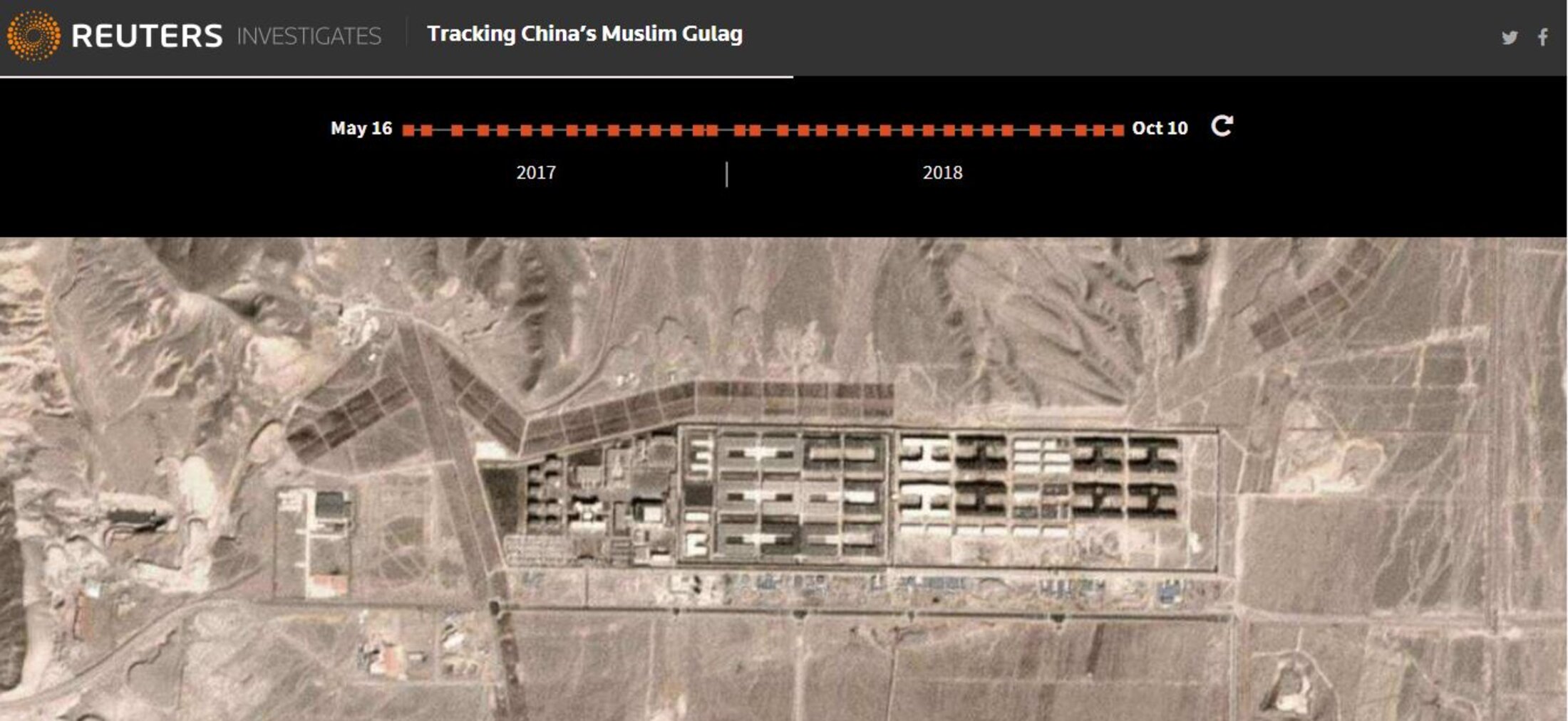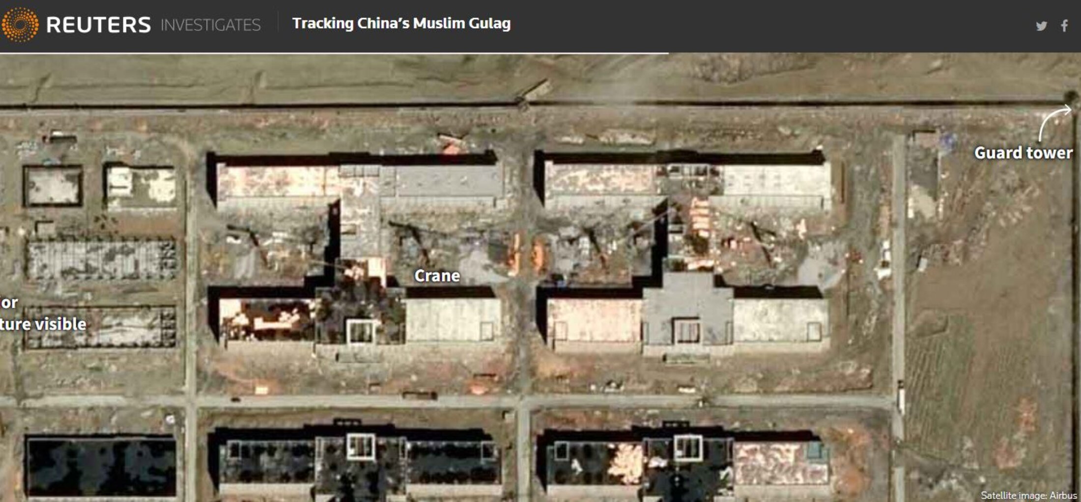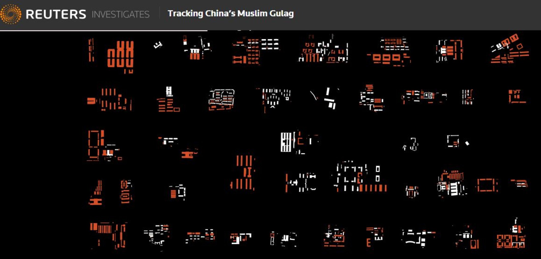 Alors que la Chine dit que les camps ouïghours sont des centres de formation professionnelle, ils sont fortement gardés en secret. Les chercheurs ont eu recours à l’imagerie par satellite pour visualiser et suivre l’expansion de ces installations. Reuters a collaboré avec Earthrise Media, un groupe au but non lucratif qui analyse les images satellites, pour tracer la construction et l’agrandissement de 39 de ces camps, qui avaient initialement été identifiés à l’aide de documents accessibles au public, tels que des appels d’offres pour la construction. L'examen bâtiment par bâtiment de ces installations a révélé que l'empreinte de la zone bâtie avait presque triplé au cours de la période de 17 mois comprise entre avril 2017 et août 2018. Ensemble, les éléments construits dans ces 39 installations couvrent maintenant une surface d'environ la taille de 140 terrains de football.