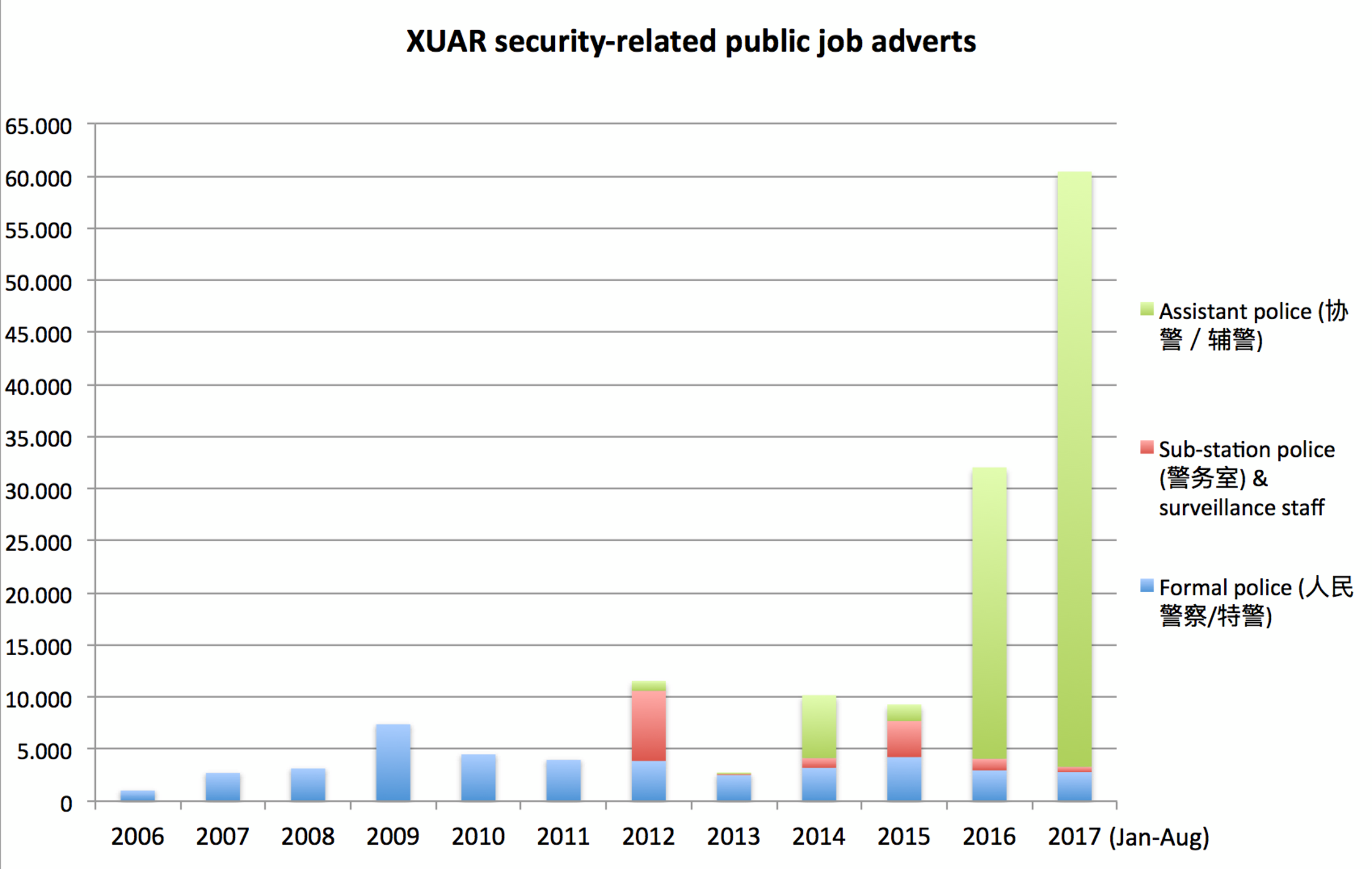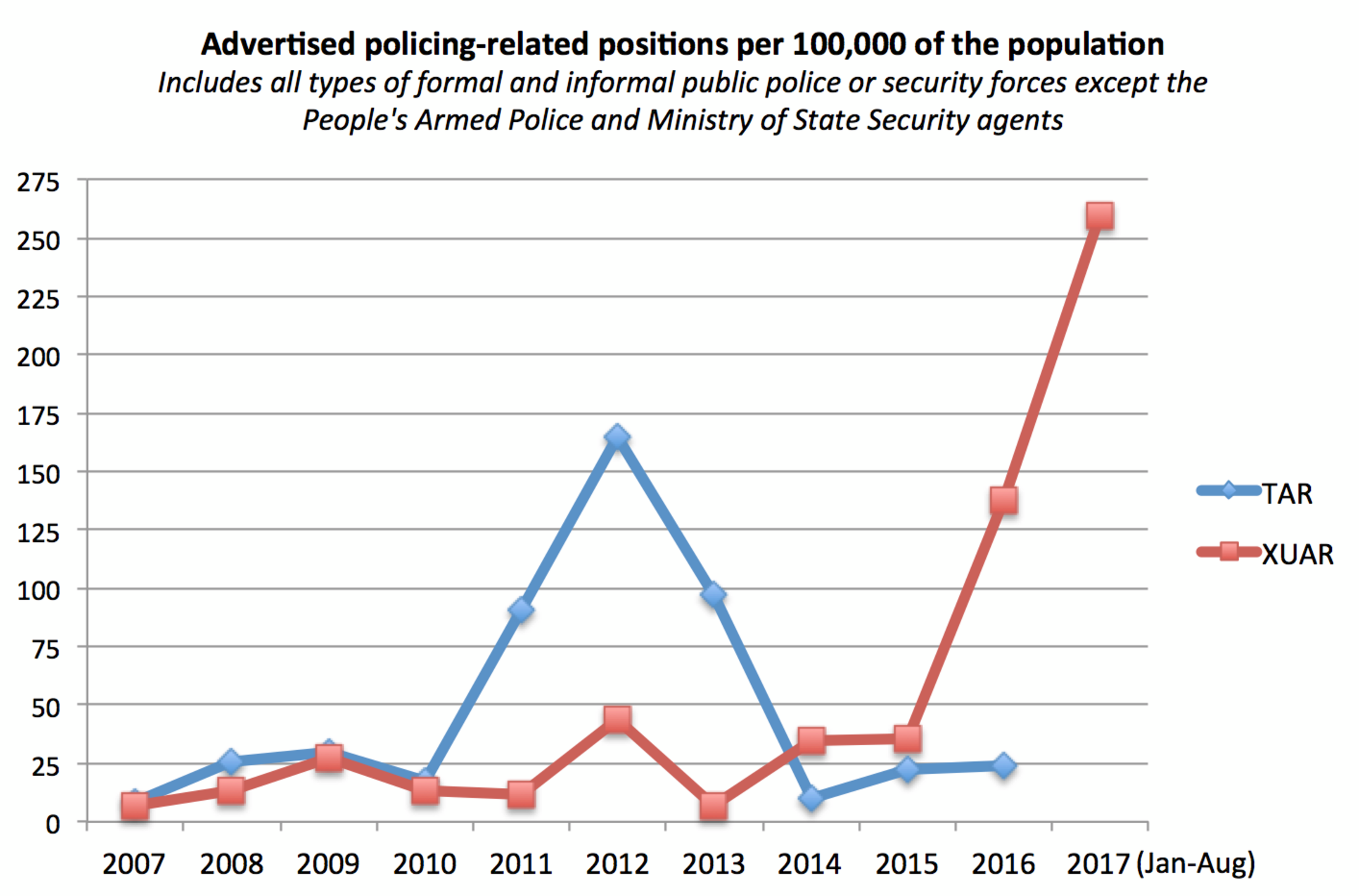En comparant les chiffres pour les deux régions par habitant, les données disponibles indiquent que le XUAR pourrait maintenant avoir beaucoup plus de commissariats de police par habitant que le TAR : 323 contre les 216 du TAR pour 100 000 habitants. D'un autre côté, le RAT annonçait 400 postes liés à la police pour 100 000 habitants sous le règne de Chen Quanguo, tandis que le Xinjiang annonçait 394 postes de ce type. [4] Pourtant, le renforcement de la sécurité au Xinjiang se poursuit et devrait dépasser le niveau atteint dans le TAR dès septembre de cette année. Cela dit, le nombre important de postes annoncés dans la région XUAR pendant une si courte période rend apparemment de plus en plus difficile l'attraction de nouveaux candidats. [5]
