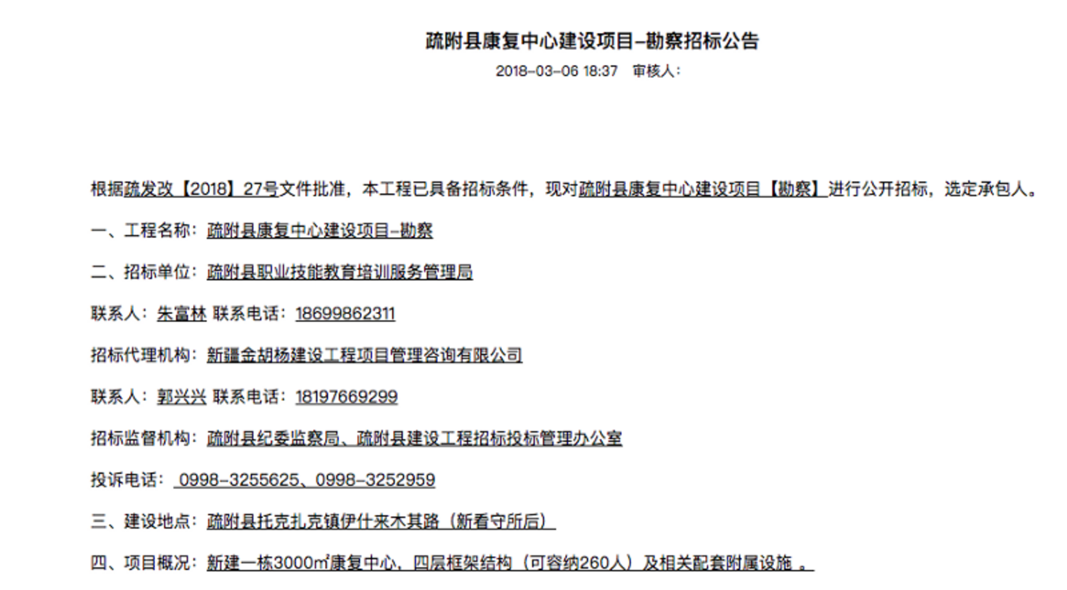 L'organe constructeur : Agence de gestion d'offres du Bureau de la justice du district de Shufu : Filiale N°1 de Kashgar de la Société Xinjianlian de conseils et gestion de projets du Xinjiang.