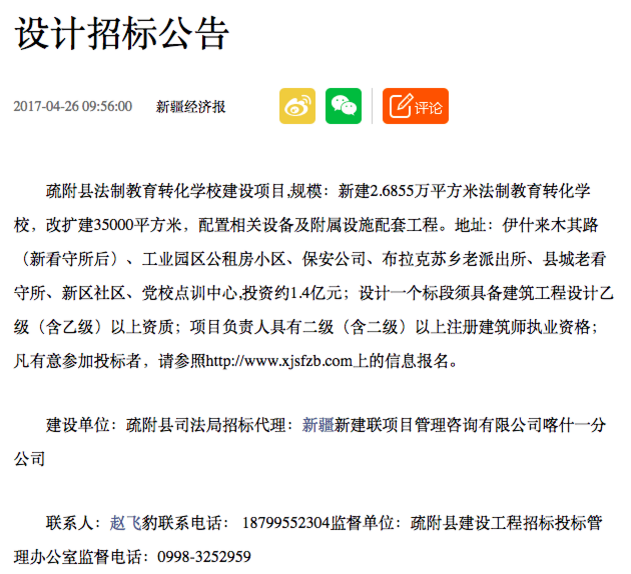 Projet de construction de l'école de transformation par l'éducation juridique du district de Shufu: La construction récente de 26 855 mètres carrés de l'école de conversion par éducation juridique sera reconstruite en l'élargissant à 35 000 mètres carrés, configuration d'équipements connexes et d'installations supplémentaires est nécessaire. L'adresse : Rue de Ishlemchi (derrière le nouveau centre de détention), quartier résidentiel à la location du quartier du parc industriel, société de vigiles, l'ancien commissariat du canton de Bulaqsu, l'ancien centre de détention du centre ville du district, nouveau quartier résidentiel, centre de formation intensive de l'école du parti, le montant d'investissement 140 millions ; La conception d'une offre doit avoir une qualification de classe B (y compris classe B) ou supérieure dans la conception architecturale, la personne en charge du projet a une qualification enregistrée d'un architecte inscrit de niveau 2 (y compris la classe 2) ou plus;Toute personne intéressée, veuillez vous référer au site http://www.xjsfzb.com et vous y inscrire.
