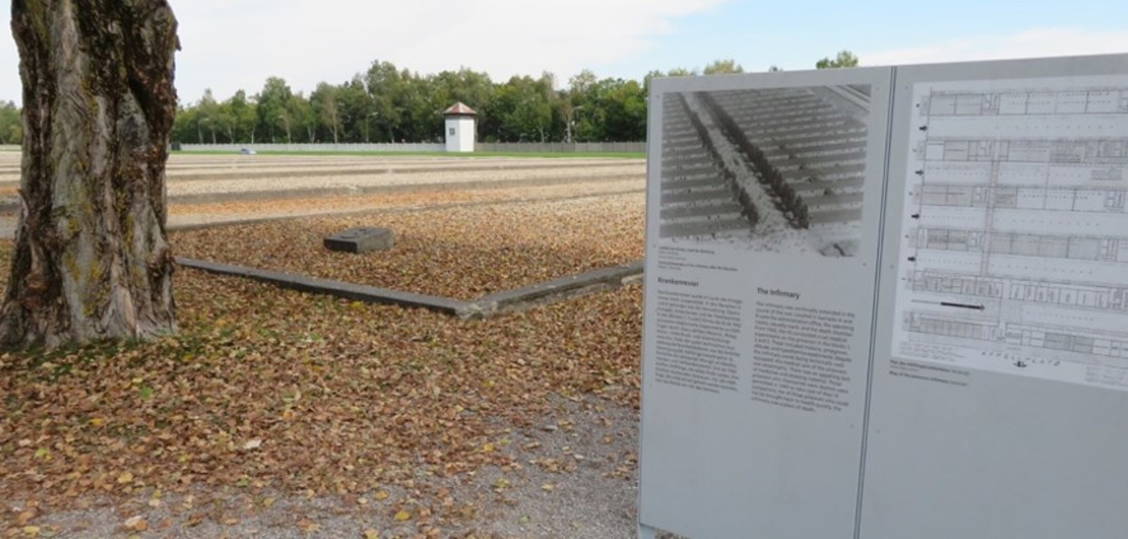 La première lettre à gauche : « C'est pourquoi je voudrais dire ici que tout ce que j'ai vu et entendu, ainsi que les conditions de vie, les installations matérielles et sanitaires du camp, y compris le traitement, l'alimentation et le travail du prisonnier m'ont impressionnée. » (Lettre de remerciement de Guillaume Favre, membre du comité international de la Croix-Rouge à Heinrich Himmler le 19 octobre 1938.