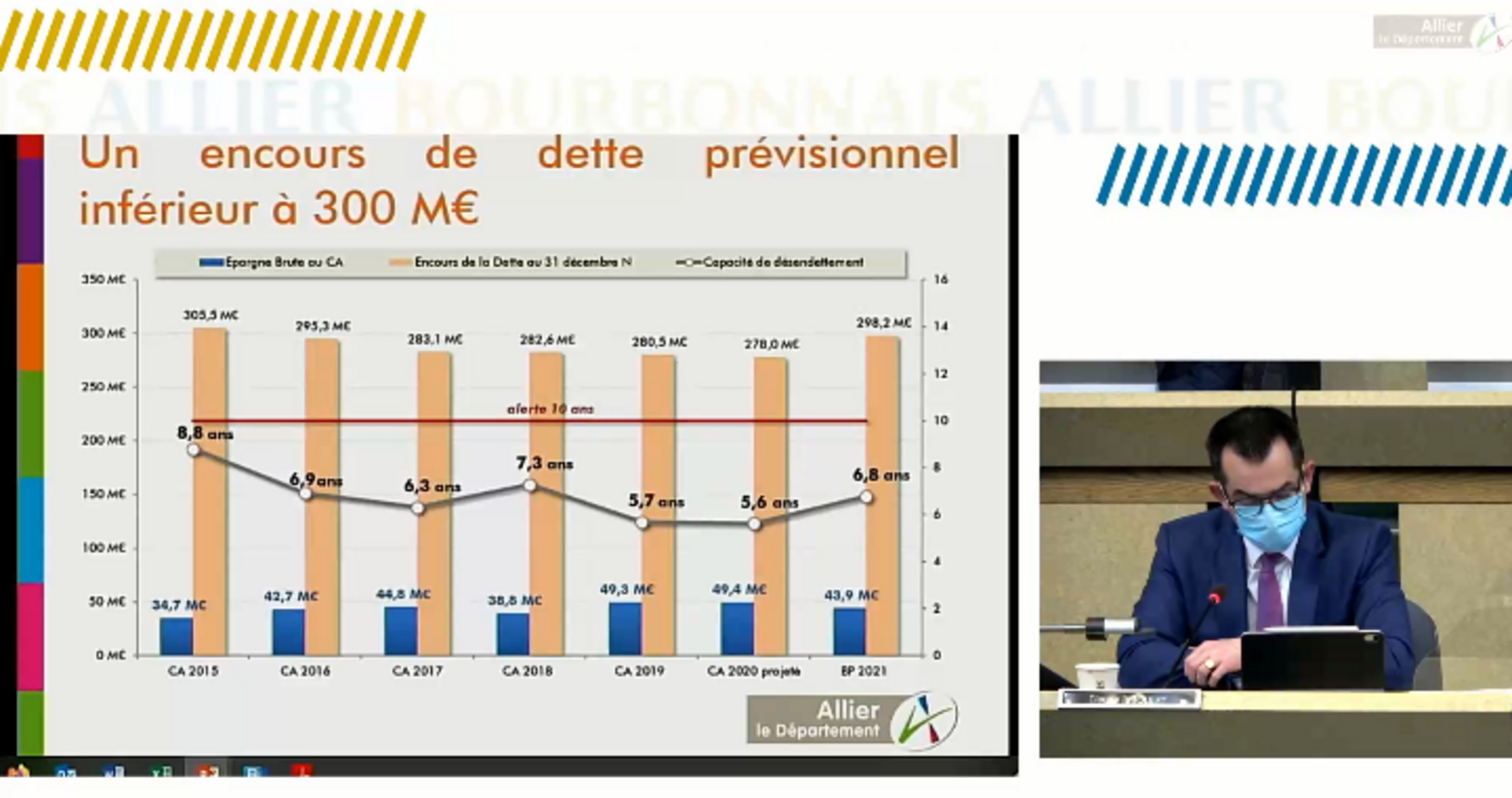 • Au fil de la discussion, j’ai aussi compris que la droite, qui se vantait d’avoir « administré un remède de cheval » (suite à la gabegie supposée de ses prédécesseurs socialo-communistes) et en-même-temps « réaugmenter les investissements », le tout en déplorant l’abandon de l’Etat, laisse en 2021 la dette à 298 millions €, c’est-à-dire au même niveau qu’à son arrivée à l’automne 2015 (305,5M€).