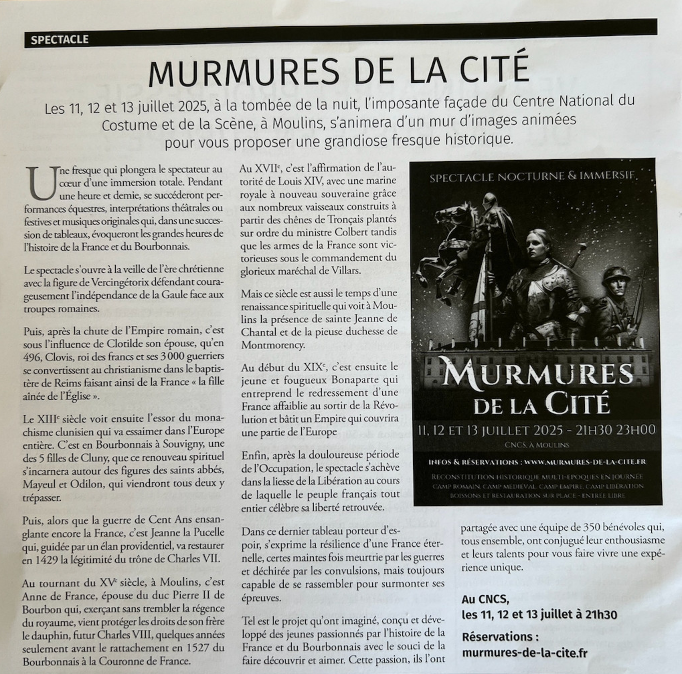 Le spectacle concocté par Murmures de la cité est à l'évidence un spectacle d'extrême droite. Tout l'indique, à commencer par son menu, qui promeut monarchie, christianisme et hommes providentiels (Vercingétorix, Clovis, Napoléon...), comme le faisaient en leur temps les historiens de l'Action française Jacques Bainville et Pierre Gaxotte. Pour évoquer l'Allier ont été convoqué·es les abbés de Cluny Mayeul (vers 910-994) et Odilon (vers 962-1048) inhumés à Souvigny, Anne de Beaujeu (1461-1522), Jeanne de Chantal (1572-1641) et Marie-Félicie des Ursins (1600-1666), ainsi que le maréchal de Villars (1653-1734) : ces choix traduisent une vision pour le moins partielle – pour ne pas dire falsifiée – de l'histoire, comme l'ont souligné les archéologues auvergnat·es en lutte, qui passe notamment sous silence les opposants au coup d'Etat du 2 décembre 1851 (particulièrement nombreux dans les cantons de Lapalisse et du Donjon), l'élection en 1882 du premier maire socialiste Christophe Thivrier (à Commentry), la naissance des premiers syndicats agricoles au début du XXe siècle et les combats de la pionnière Hubertine Auclert (1848-1914) ou de l'institutrice révolutionnaire Jeanne Labourbe (1877-1919) – je recommande la lecture du communiqué « Les Murmures assourdissants de la domination masculine » publié par quatre organisations féministes de l'Allier.