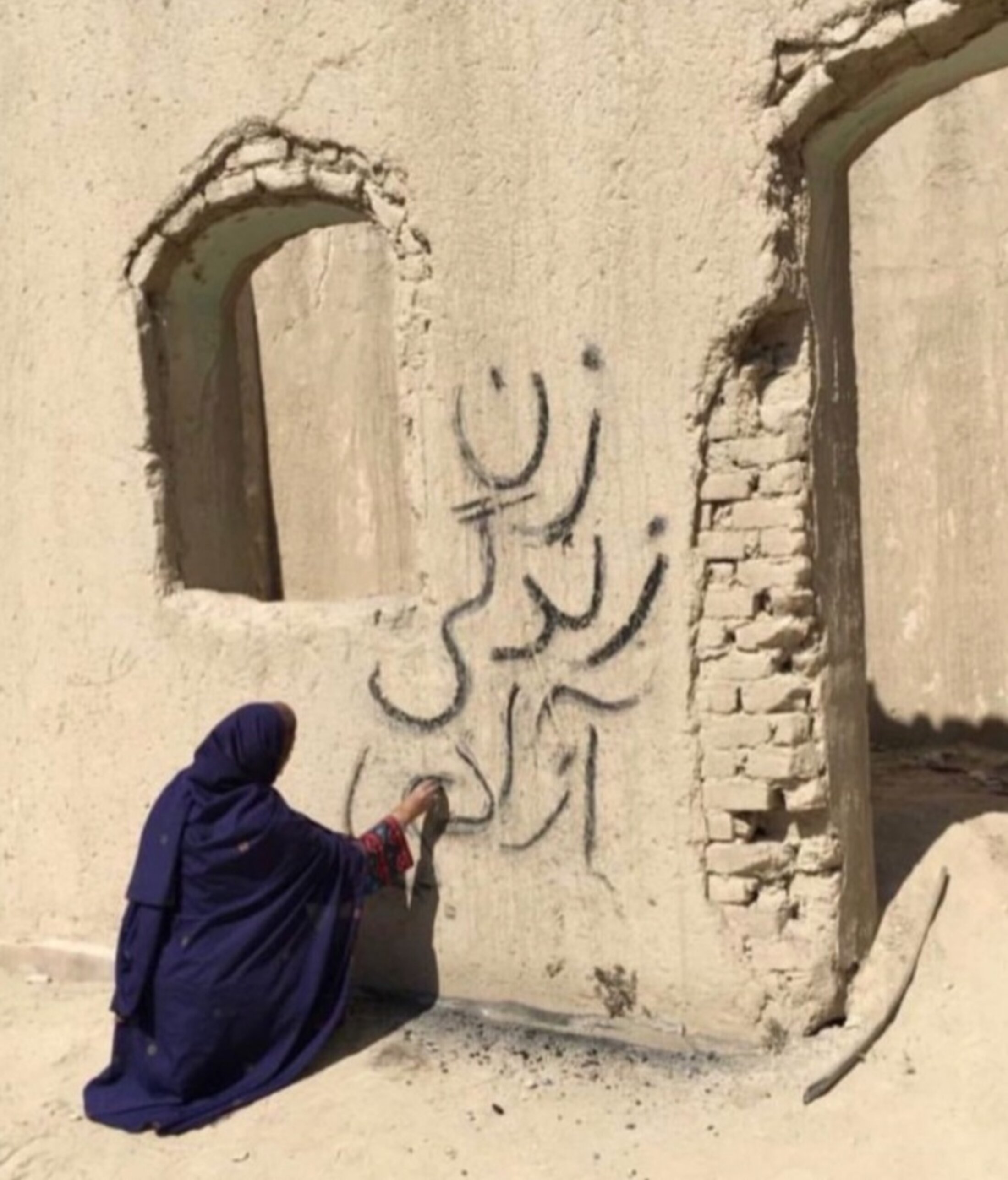 Tout d'abord, ce détournement d'une photo déjà superbe en elle-même, d'une femme en tchador traçant le slogan "femme, vie, liberté" sur un mur ensoleillé (devenue maîtresse d'école dans l'Iran libéré de l'image suivante).