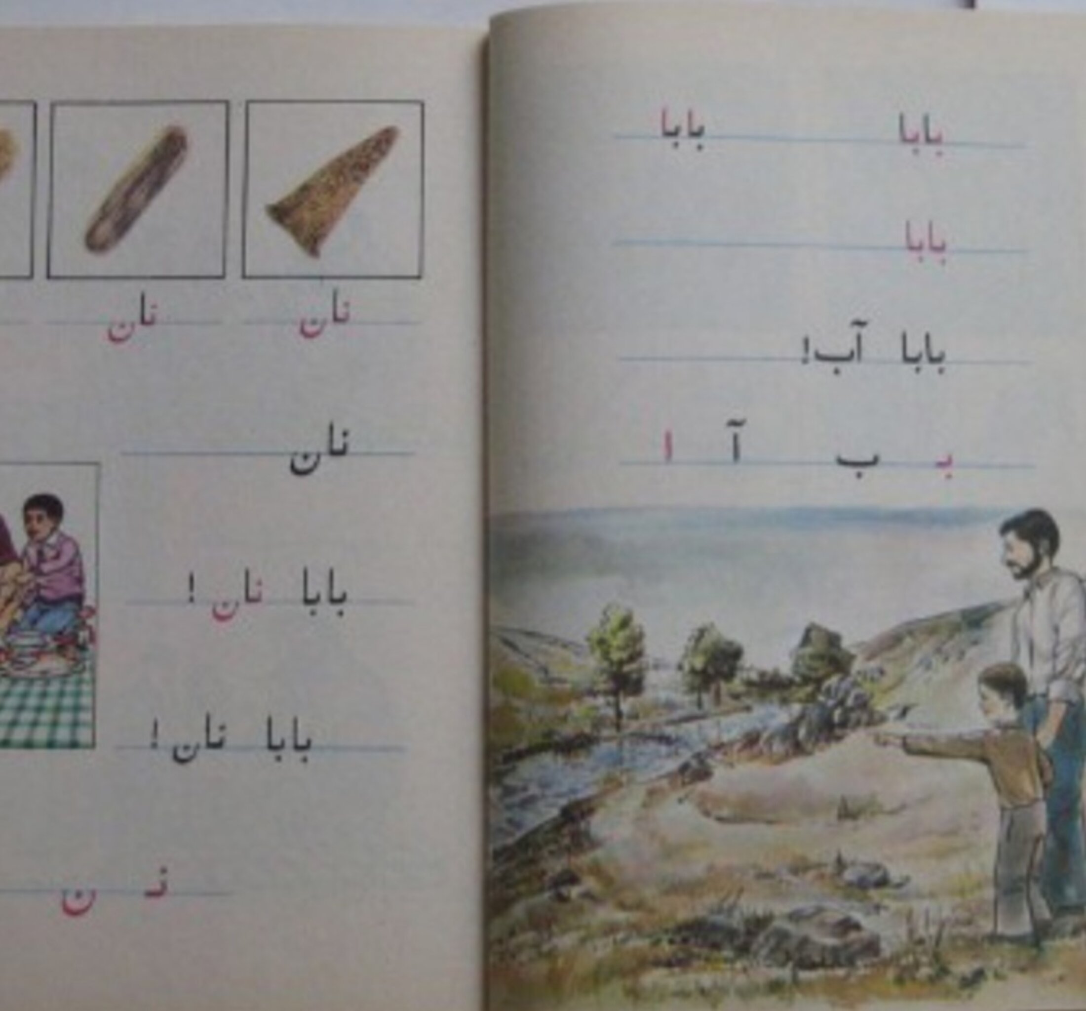 Cela vous permet aussi d'avoir vous aussi, maintenant, une référence visuelle de manuel classique de première année d'école. De cette manière, vous aussi, comme tous les iraniens qui ont appris à lire en Iran, pourrez comprendre la force des images suivantes.
