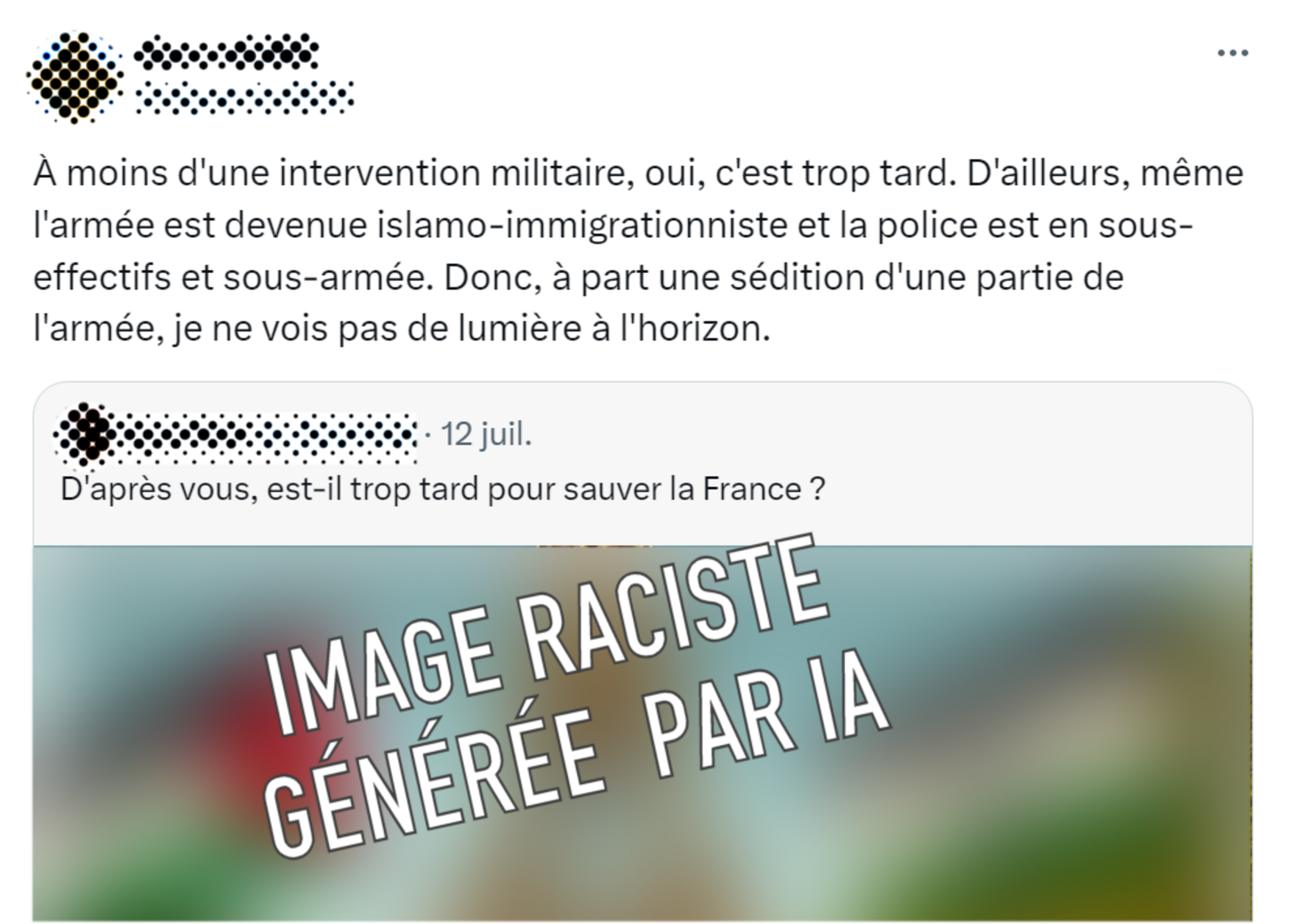 Ce glissement vers la préparation au conflit armé fait frémir. Les milices ou actions terroristes ne s’organisent généralement pas sur X, mais à la vue de ce qui émerge dans cet espace public, on imagine bien que sur les messageries privées comme Telegram, nos craintes se transforment probablement en réalité.