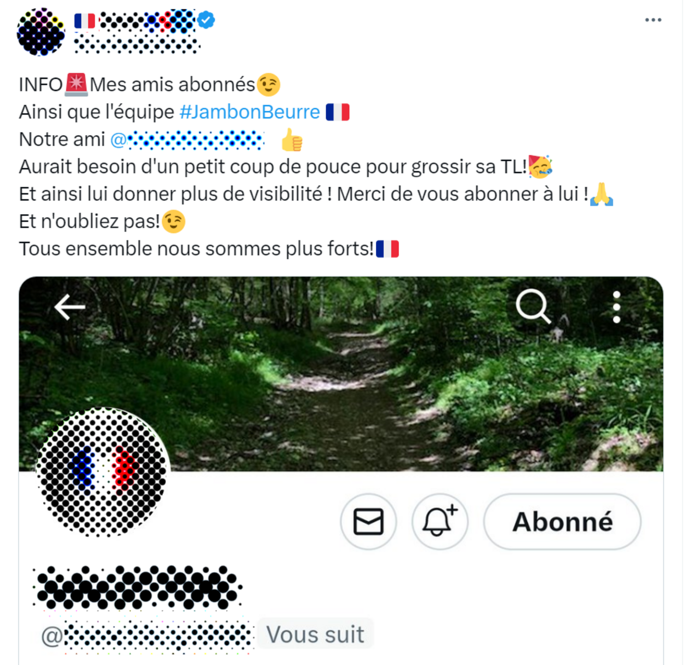 Gontrand s’abonne à 4 ou 5 "stars" de la fachosphère : un ancien de Génération identitaire devenu cadre zemmourien, un avocat très médiatique habitué de CNews, et quelques twittos (Xos ?) connus pour leur influence dans le microcosme fascisant de X. Ensuite il suffit de laisser l’algorithme de recommandation faire le reste et de s'abonner aux comptes proposés.