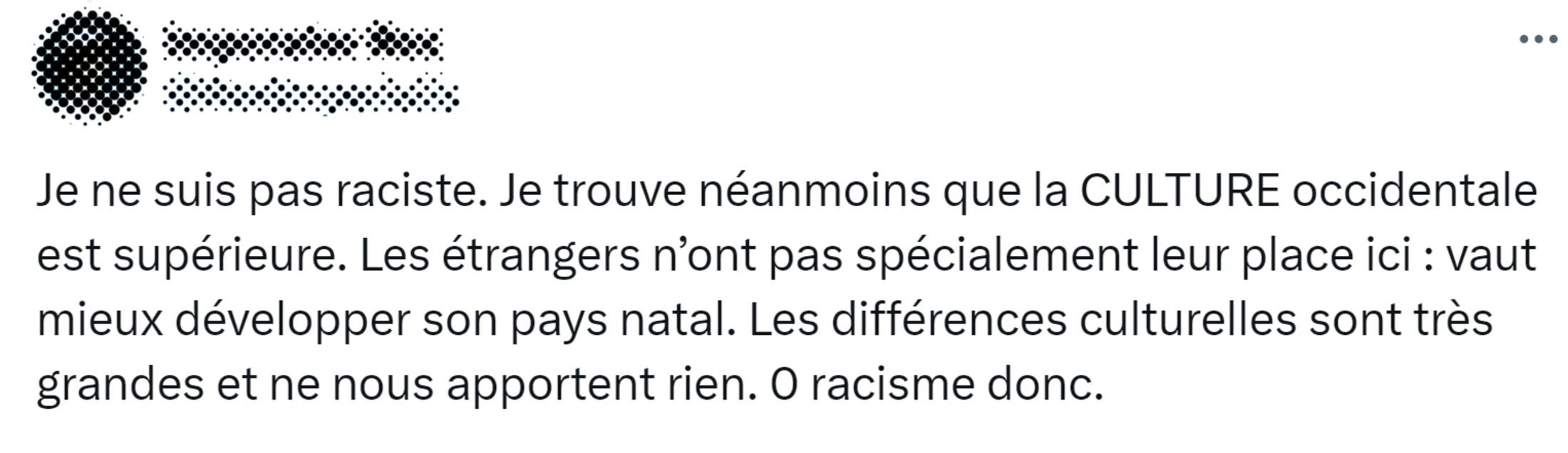En langage plus ou moins codé, la haine primaire, brutale, s'étale librement, est reprise, likée et retweetée. Qu'on en fasse des mèmes, de l'humour, des chansons, des commentaires cyniques ou des lâchages, qu'on y parle de racailles, de chances pour la France, de migrants, de petits anges partis trop tôt, de sauvages, d'islamistes, de bogmoules, de barbares, de muzz, c'est toujours la même population qui est visée, le même racisme qui s'exprime.