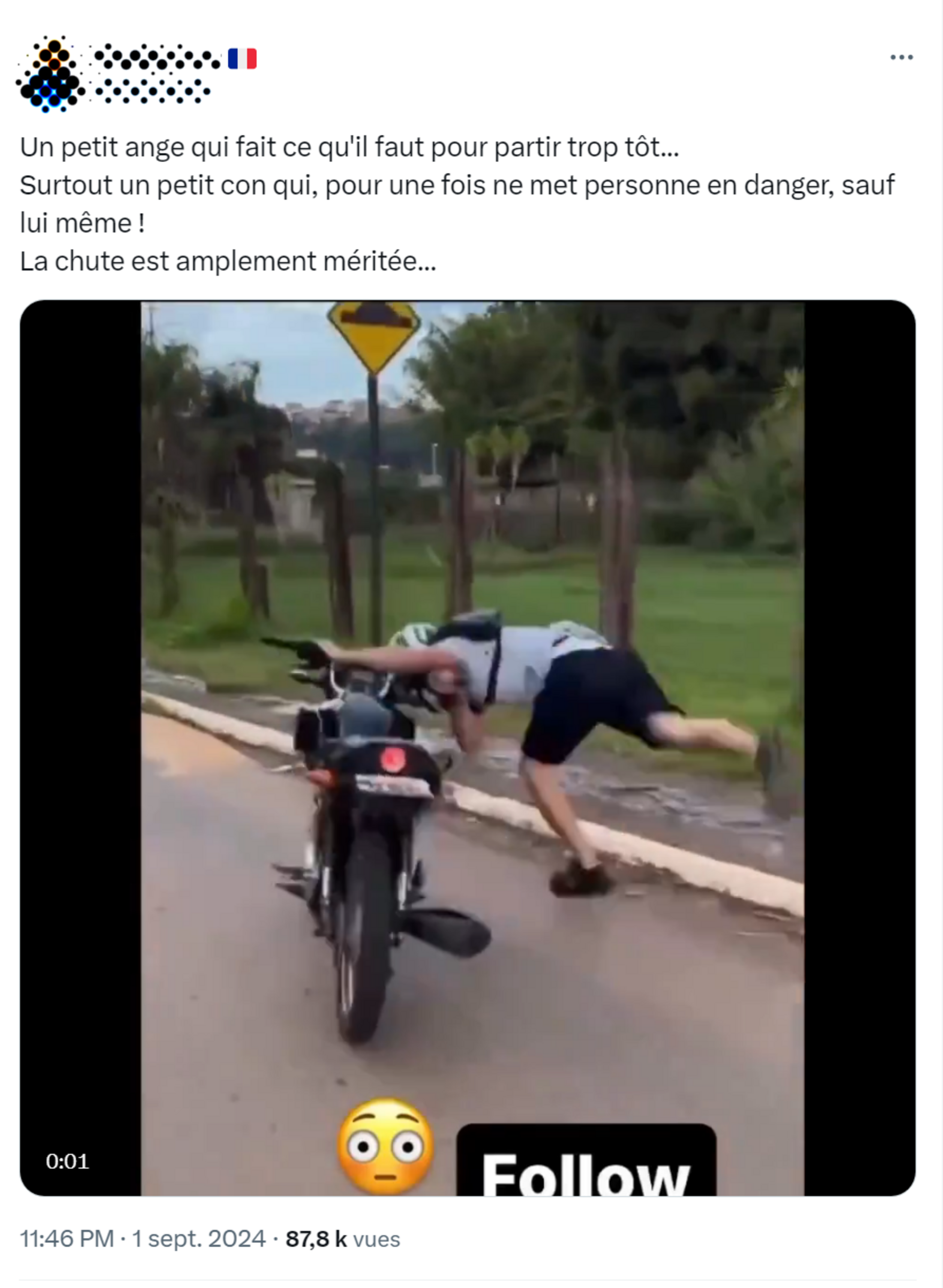 - Enfin, celles qui présentent la mort sans idéologie claire, et qui contribuent à l'insensibilisation à la violence. Ou, encore mieux, qui montrent un jeune de 14 ou 15 ans se tuer ou se blesser gravement (il n’y a jamais de contexte ou de bilan des accidents montrés) en faisant l'idiot en scooter. Là, rire général, "bien fait pour la racaille", "un sauvage de moins". La bestialité et la sauvagerie brillent alors dans l’œil de ceux qui regardent.