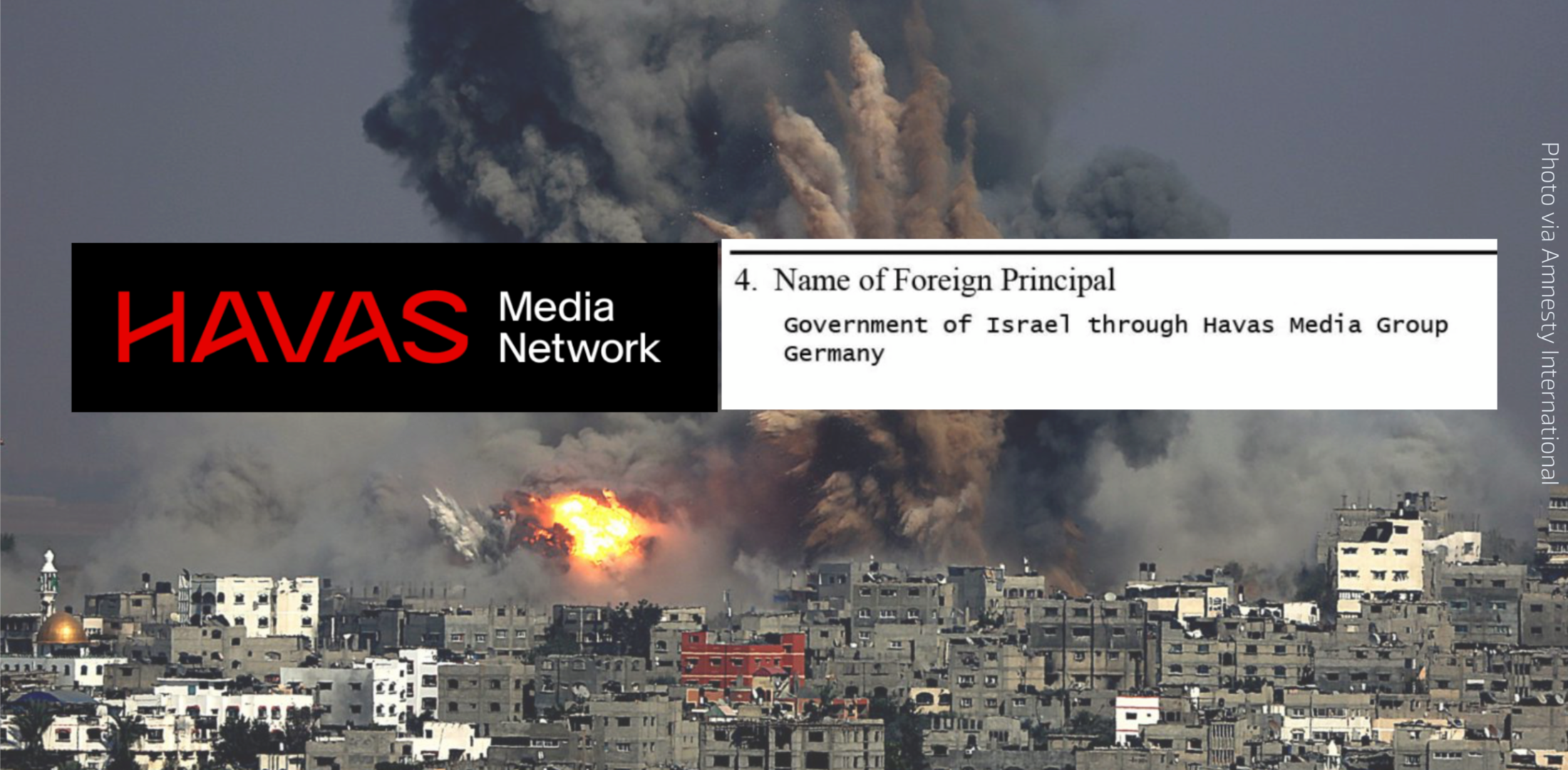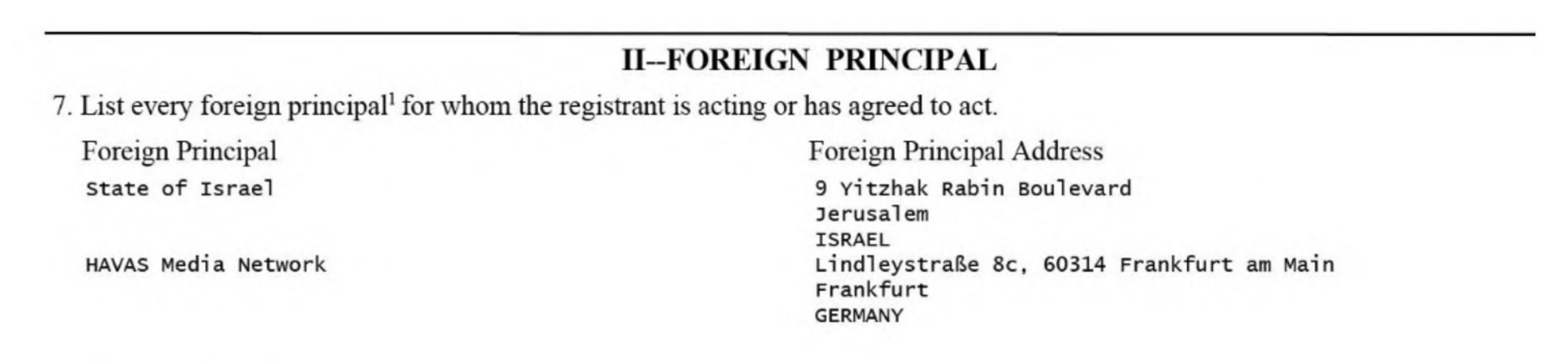 Bridges Partner, entreprise américaine, doit déposer une déclaration FARA lorsqu’elle travaille pour le compte d’un gouvernement étranger. Cette déclaration est publiquement exposée, et montre que Havas est directement commanditée par le gouvernement israélien et plus précisément le Ministère des affaires étrangères.