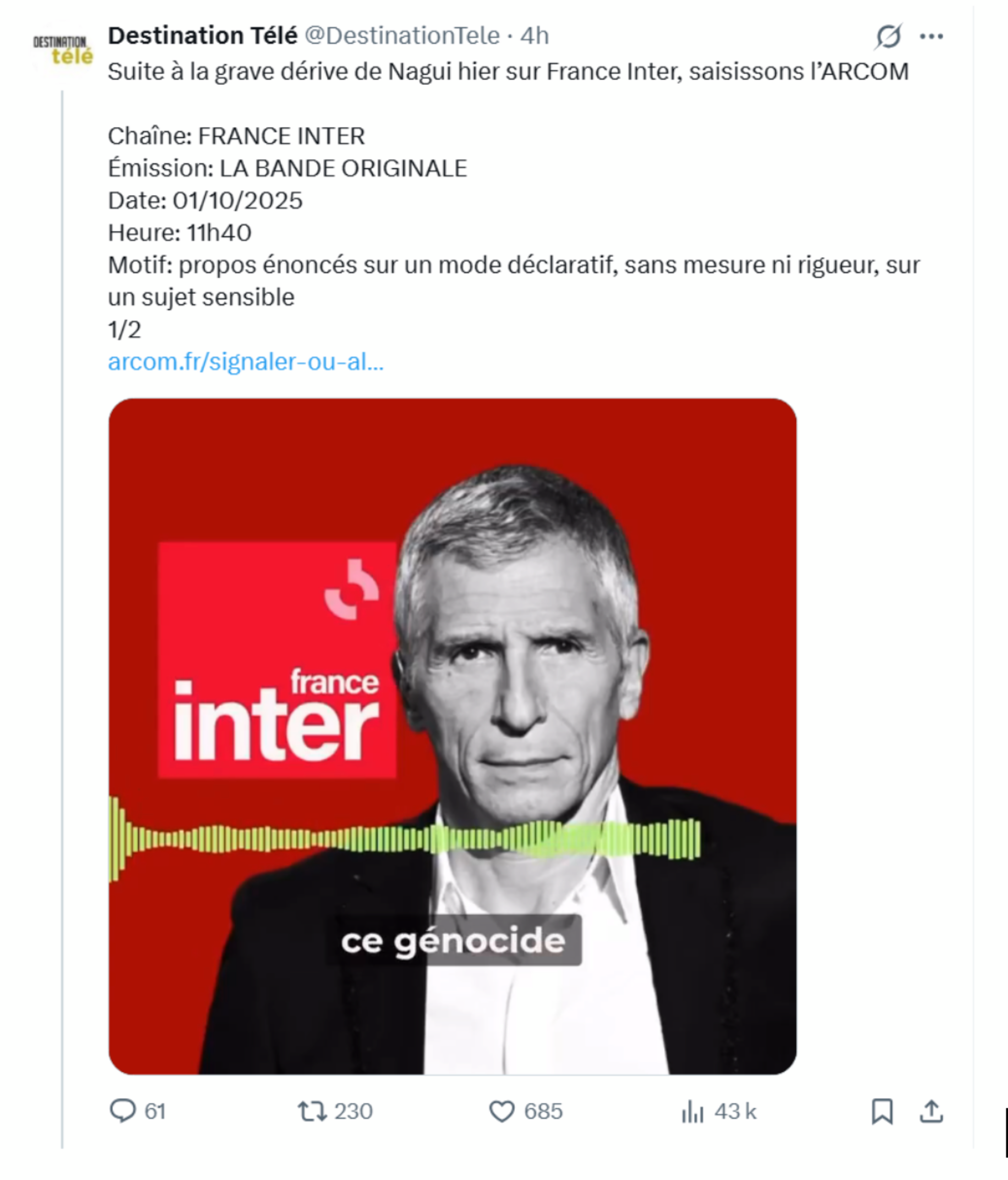 Ceci soulève donc quelques interrogations sur les prises de positions des comptes notoirement liés à la Bollosphère française, par exemple le compte X DestinationTélé qui saisit l’Arcom parce qu’un présentateur de France Inter a prononcé le mot “génocide”.