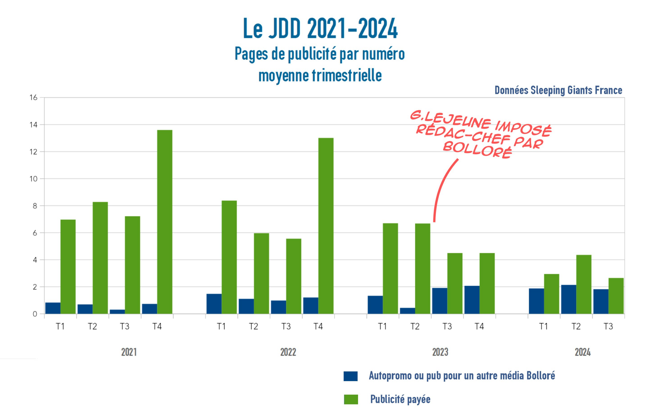 Mi-2023, Geoffroy Lejeune, viré de Valeurs Actuelles, est donc nommé par Bolloré à la tête du JDD, qui est alors en difficulté mais encore bien vivant. La centaine de journalistes, mécontents de voir leur journal devenir un relais de la propagande d'extrême-droite, entame une grève historique qui durera 40 jours. Mais fidèle à sa méthode déjà éprouvée avec iTélé/CNews, Bolloré ne bronche pas et finit par "laisser partir" tout le monde avec de solides indemnités. La place est nette, il a maintenant les mains libres.