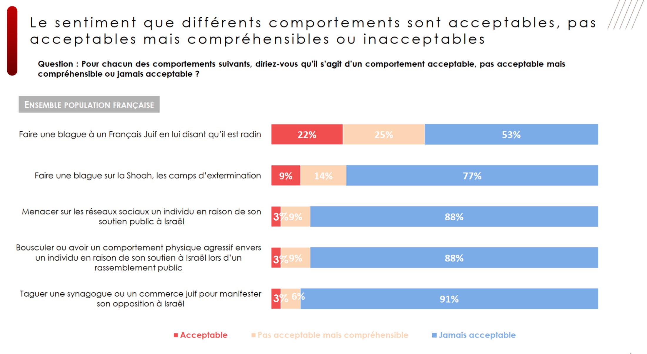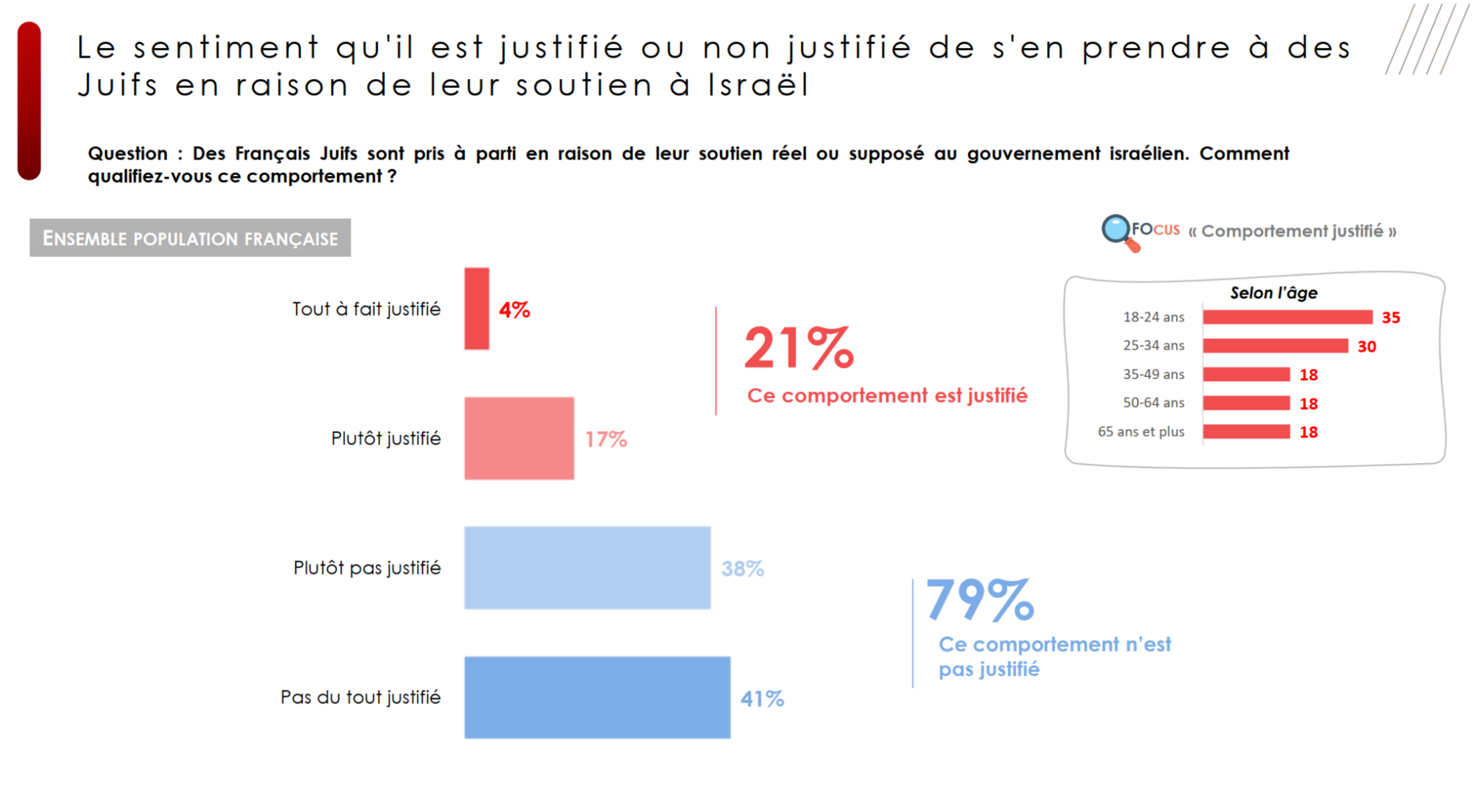Question : “Des Français Juifs sont pris à parti en raison de leur soutien réel ou supposé au gouvernement israélien. Comment qualifiez-vous ce comportement ? (Tout à fait justifié / Plutôt justifié / Plutôt pas justifié / Pas du tout justifié )”