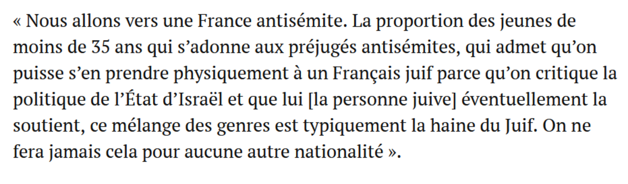 Oublié le soutien “réel”, oublié, le fait qu’il puisse s’agir de confrontation verbale, les personnes ayant répondu à cette question par “plutôt justifié” sont directement qualifiés d’antisémites.
