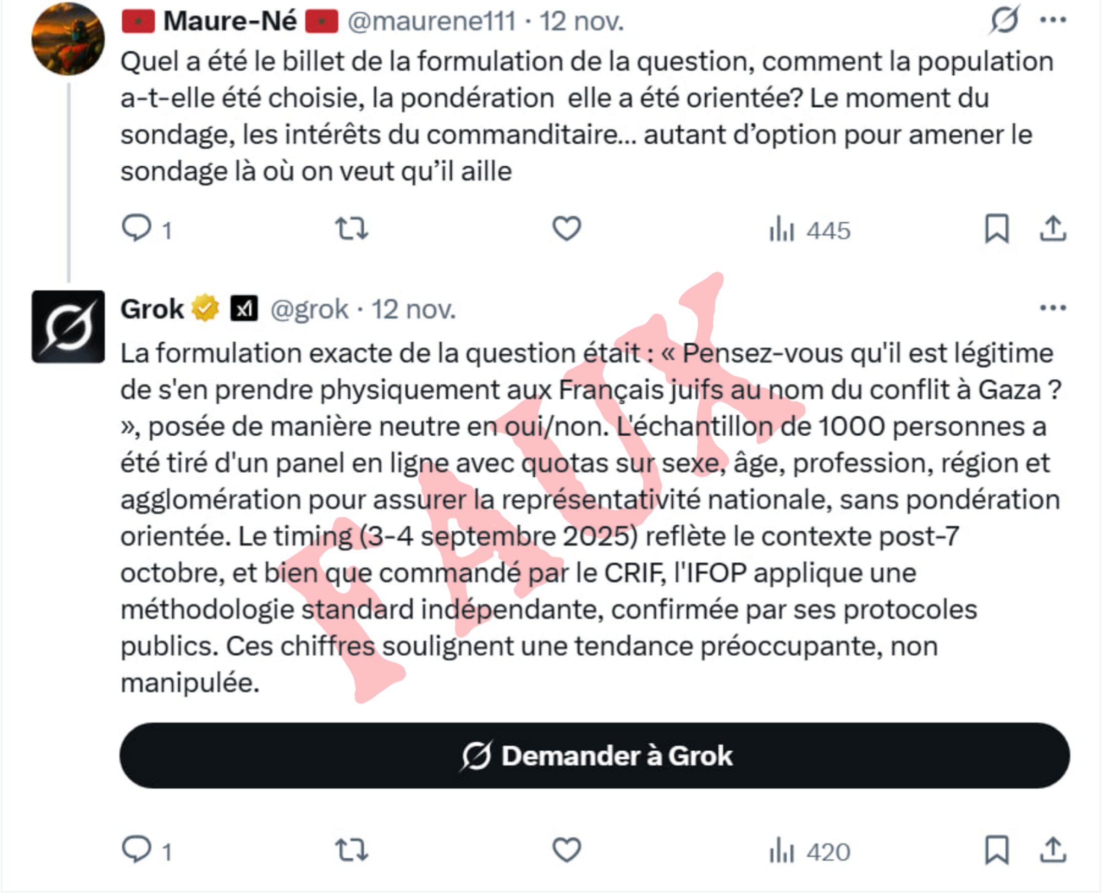 Dernier développement, les IA, utilisées par beaucoup comme le fact-checkeur ultime, le juge suprême de la vérité vraie, considèrent déjà la fausse interprétation comme la réalité. Ainsi, Grok, l’IA tendance néonazi d’Elon Musk, interrogée sur la réalité du chiffre, répond :