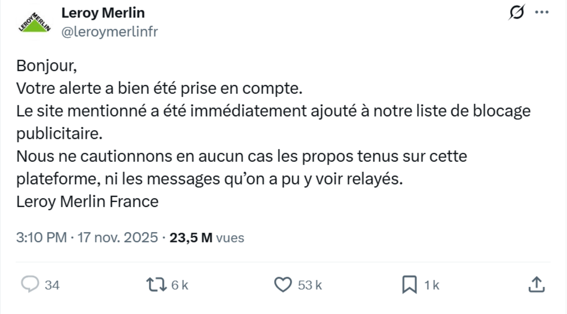 Les quelques expériences passées nous permettent de gérer ça avec une certaine sérénité : après notamment Ferrero et Décathlon (du même groupe que Leroy Merlin) pour leur retrait de l’émission de Zemmour sur CNews, nous savons qu’il s’agit d’un feu de paille et que les annonces de boycott se termineront sans conséquence notable si ce n’est avoir fait parler de la marque.