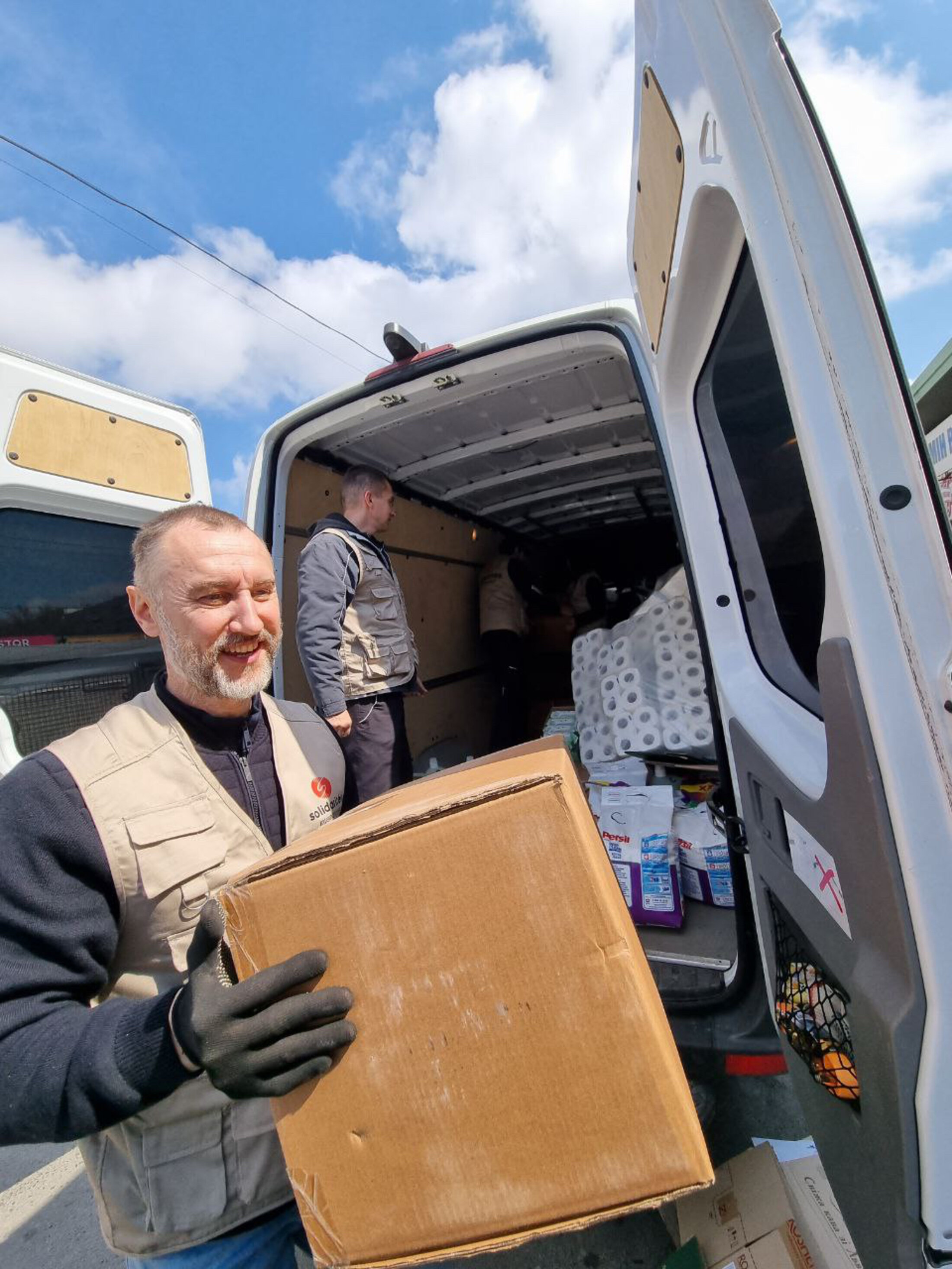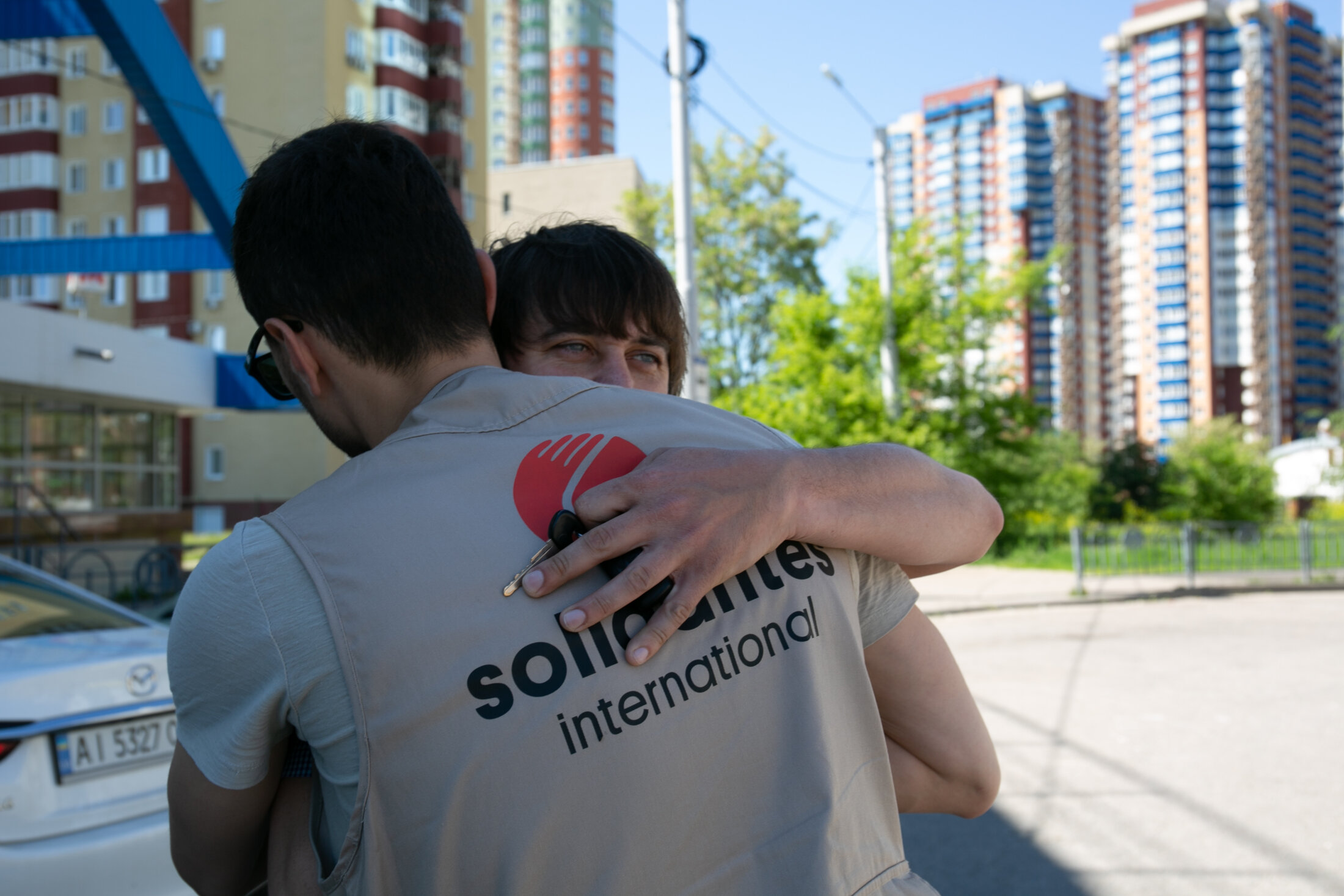Sasha et V., déplacés à cause du conflit, se sont engagés auprès de SOLIDARITÉS INTERNATIONAL pour soutenir les populations civiles victimes de la guerre. “J’habite à Kharkiv depuis mes études et lorsque la guerre est arrivée, j’ai conduit ma femme et ma fille hors de la ville puis je suis revenu pour aider” explique Sasha. Dans l’est de l’Ukraine, SOLIDARITÉS INTERNATIONAL travaille avec des associations locales et réseaux de volontaires qui, depuis le début du conflit, ont su assurer l’accès aux personnes bloquées dans les zones les plus dangereuses. 4 juin 2022, Kharkiv, Ukraine.
