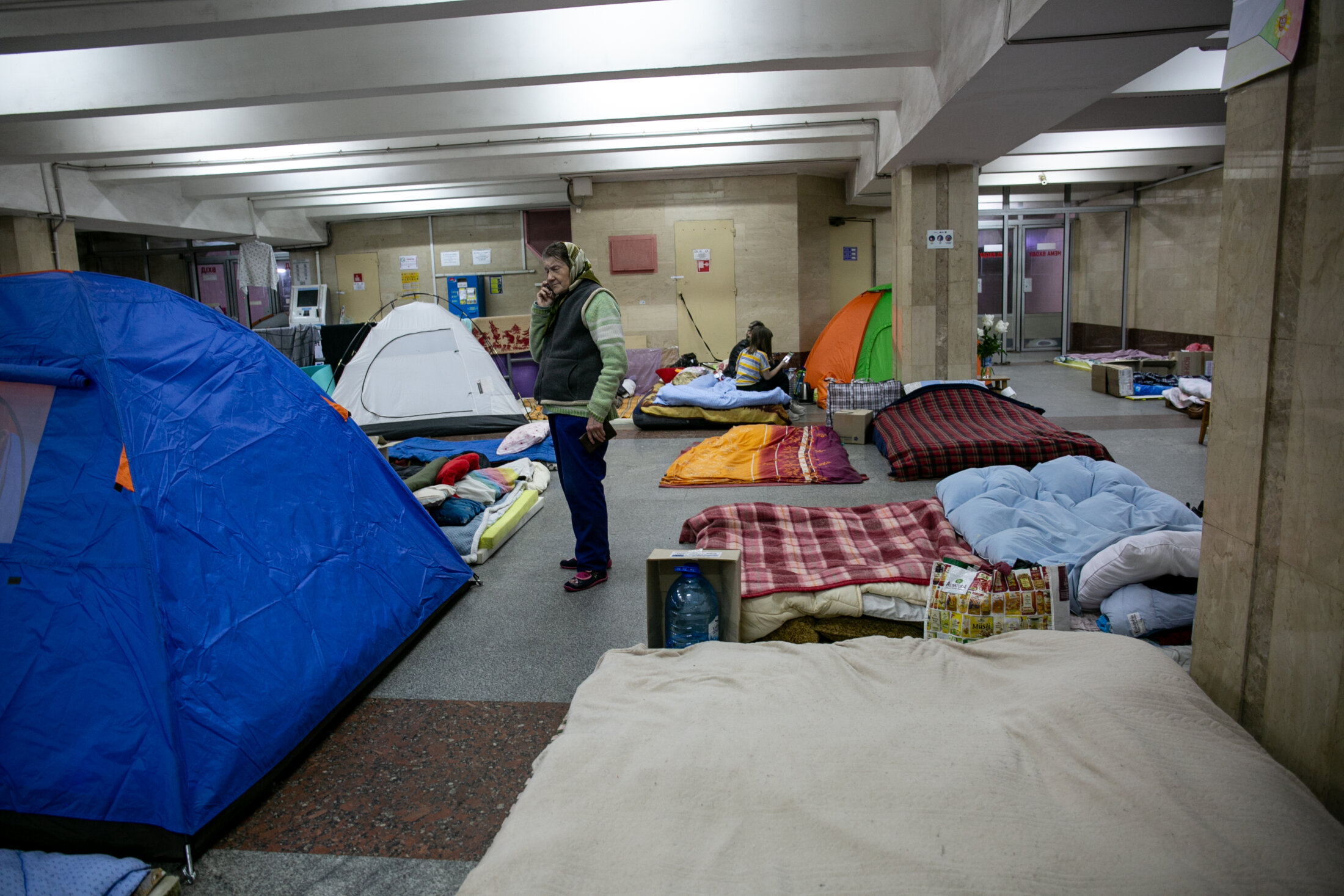 Natalia et son fils de 4 ans vivent entourés de toute leur famille dans le métro depuis le début du conflit. Ils ont tenté de retourner s’installer dans leur appartement mais les bombardements les en ont dissuadés : “Il n’est pas possible de vivre chez nous. Vivre dans le métro est notre seule solution. Nous n’avons pas d’argent pour partir vivre dans une autre ville. De toute manière, ça n’est pas plus sécurisé qu’ici. Dans le métro, nous arrivons à dormir la nuit. Nous n’entendons pas d’explosion. Chez nous, c’était horrible. Nous ne dormions pas de la nuit à cause des bombardements qui sont très bruyants. Mon fils a peur, il pleure et hurle tout le temps, à chaque son qu’il entend”. 4 juin 2022, Kharkiv, Ukraine.