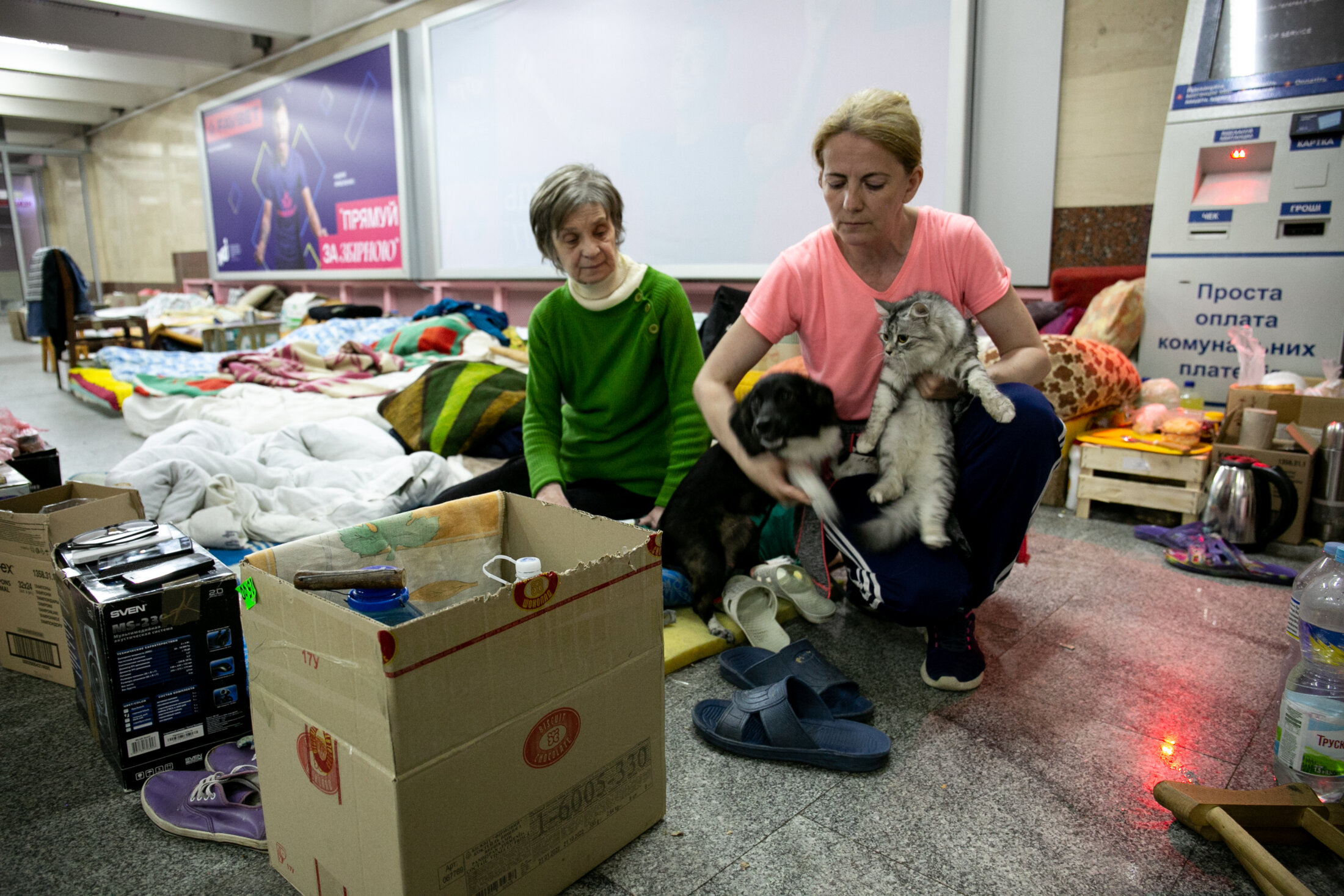 “J’habite à côté d’une base militaire. Je ne peux pas retourner vivre chez moi car un missile est tombé sur un immeuble à côté et a détruit notre toit. J’ai peur. Je ne sais pas quoi faire ni où aller. En plus, j’ai des animaux domestiques. Qu’est-ce que je peux faire ? Quand vont-ils comprendre que nous sommes des êtres vivants ? Ma mère a 90 ans, elle s’est réfugiée dans une autre station de métro car sa maison est bombardée tous les jours. Je ne sais pas comment je peux la faire évacuer “, témoigne Katarina. 4 juin 2022, Kharkiv, Ukraine.