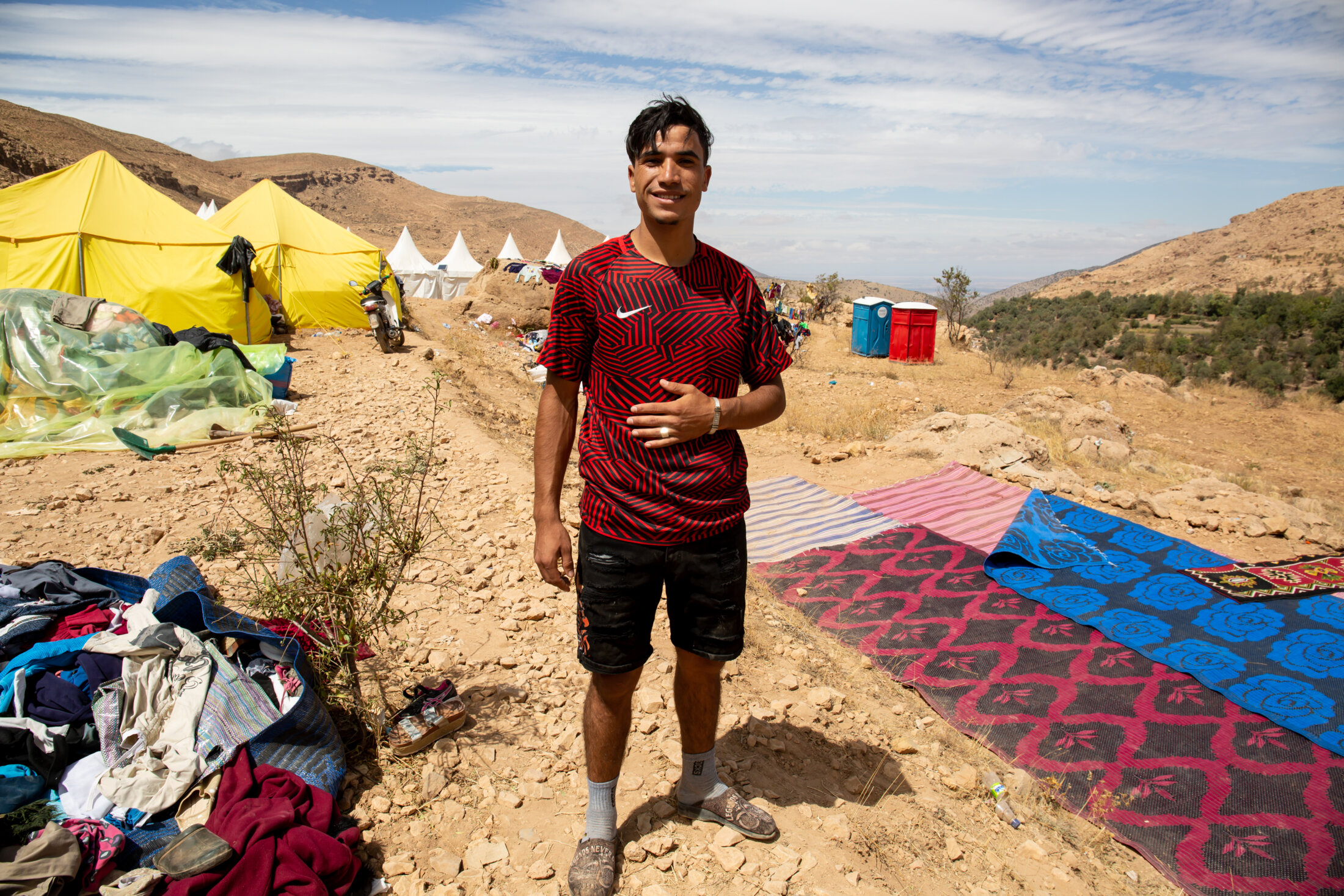 Mohamed Oubla est rescapé du village de Tighoula. Avec sa sœur de 6 ans, il vit au sein d’une zone de groupement de tentes. Le tremblement de terre a détruit la source d’eau dans laquelle le village pouvait s’approvisionner. Pour le moment, les habitants boivent grâce aux bouteilles d’eau qui leur ont été distribuées. Dans ce camp, des toilettes chimiques ont été installées afin d’éviter que les habitants ne retournent dans les maisons en partie détruites pour faire leurs besoins, car le risque d’éboulement serait trop grand. “La question de l’accès aux toilettes de manière sécurisée est primordiale dans des situations d’urgence comme celles-là, notamment pour les femmes”, confirme Anissa Bouachria, coordinatrice de la mission d’évaluation de SOLIDARITÉS INTERNATIONAL.