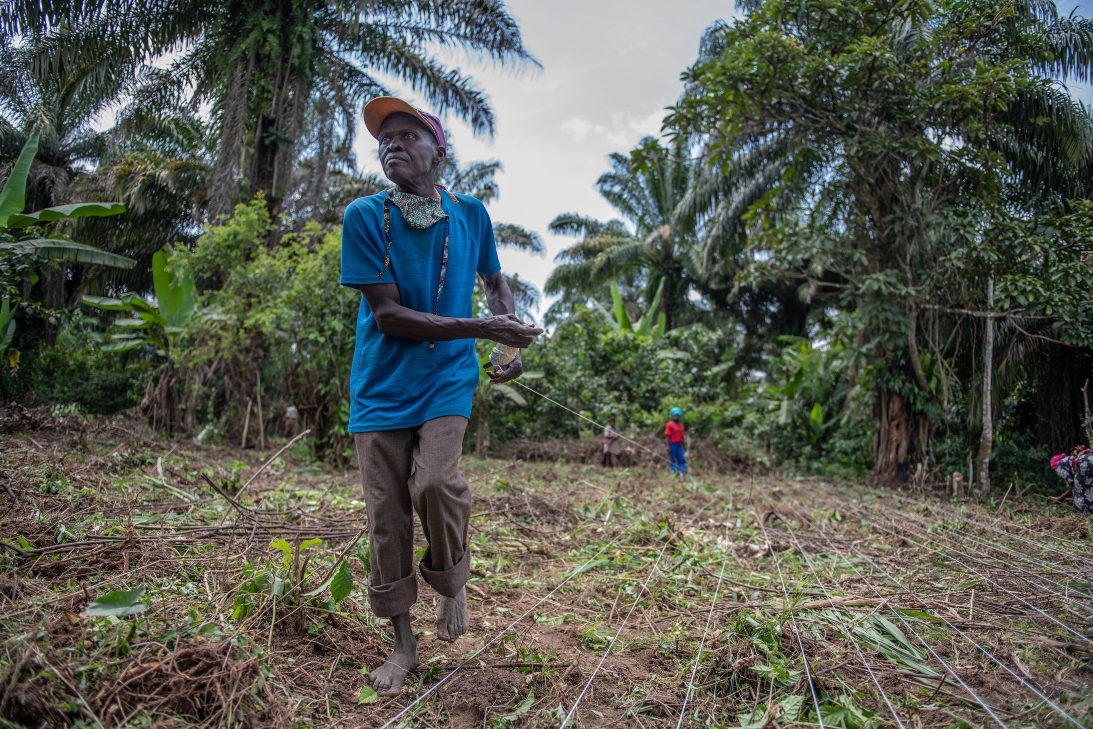 Des personnes déplacées et des membres des communautés hôtes sont formés par l’ONG SOLIDARITÉS INTERNATIONAL aux techniques d’ensemencement à travers des projets de relance agricole. Beni, République démocratique du Congo, décembre 2021.
