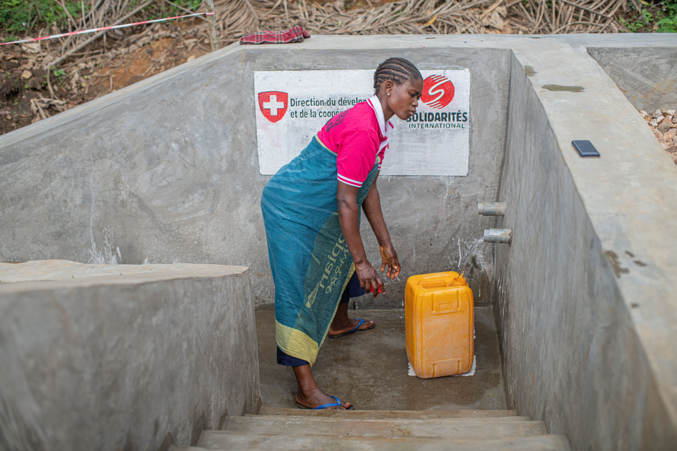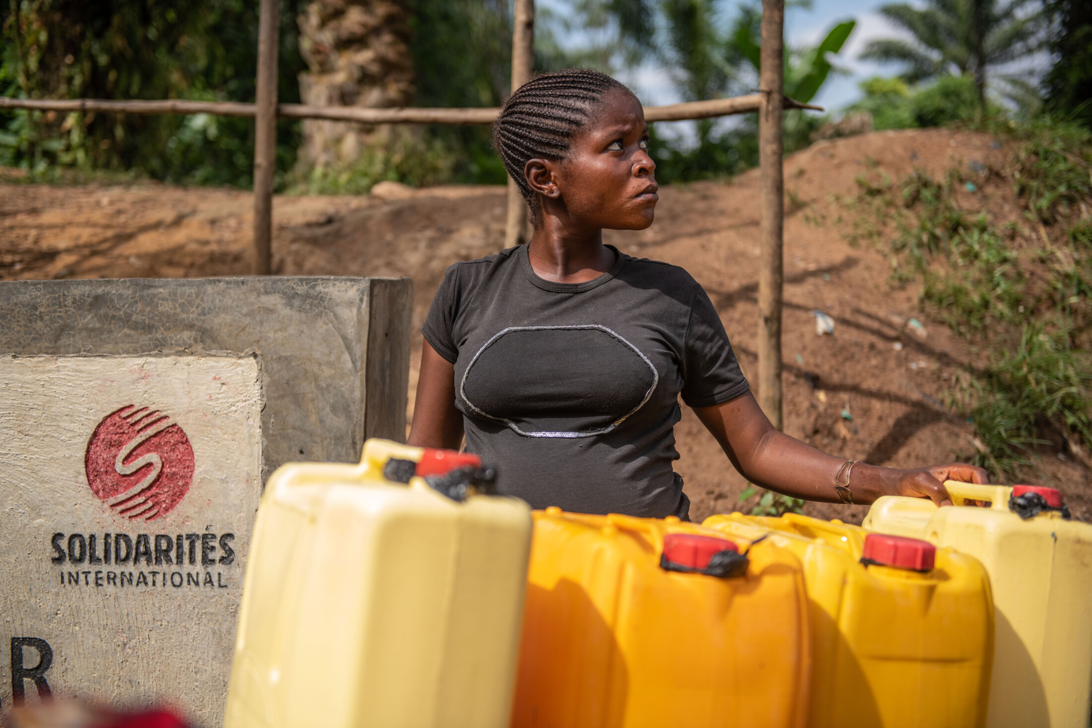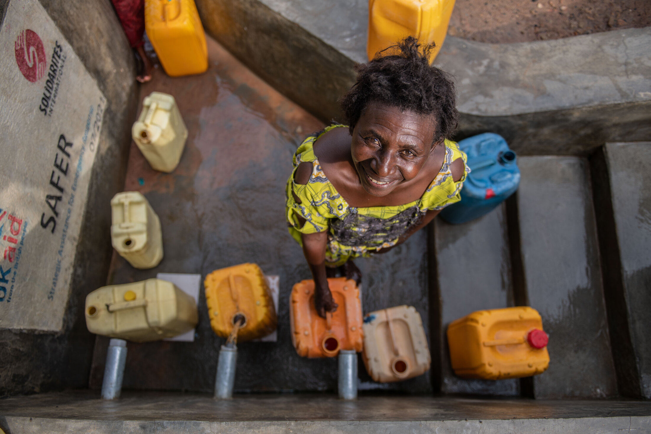 Tantine vit à Mulala sur le territoire de Beni. Elle remplit ses jerricans au point d’eau construit par SOLIDARITÉS INTERNATIONAL. « Auparavant, il nous fallait quarante minutes pour remplir un bidon d’eau, mais aujourd’hui, je remplis un bidon en moins de dix minutes », se réjouit Tantine. Beni, République démocratique du Congo, décembre 2021.