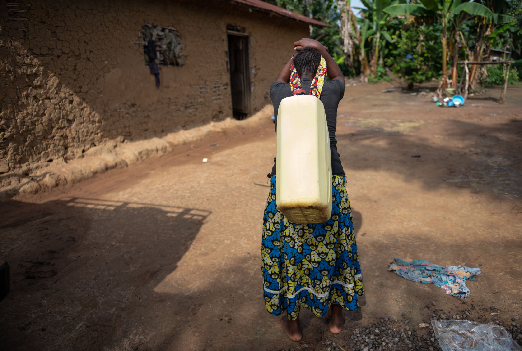 Alice chez elle. « Avec l’eau que je viens de puiser à la source, je vais pouvoir faire la lessive, la vaisselle, me laver et préparer à manger », explique Alice. Mavivi, Beni, République démocratique du Congo, décembre 2021.