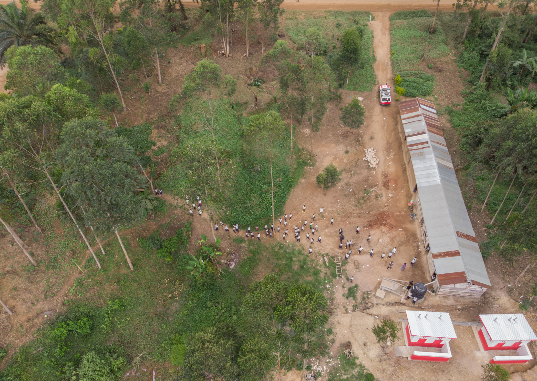 Vue aérienne de deux blocs de latrines construits par SOLIDARITÉS INTERNATIONAL pour l’école primaire Huruma sur le territoire de Beni. Huruma, Beni, République démocratique du Congo, décembre 2021.