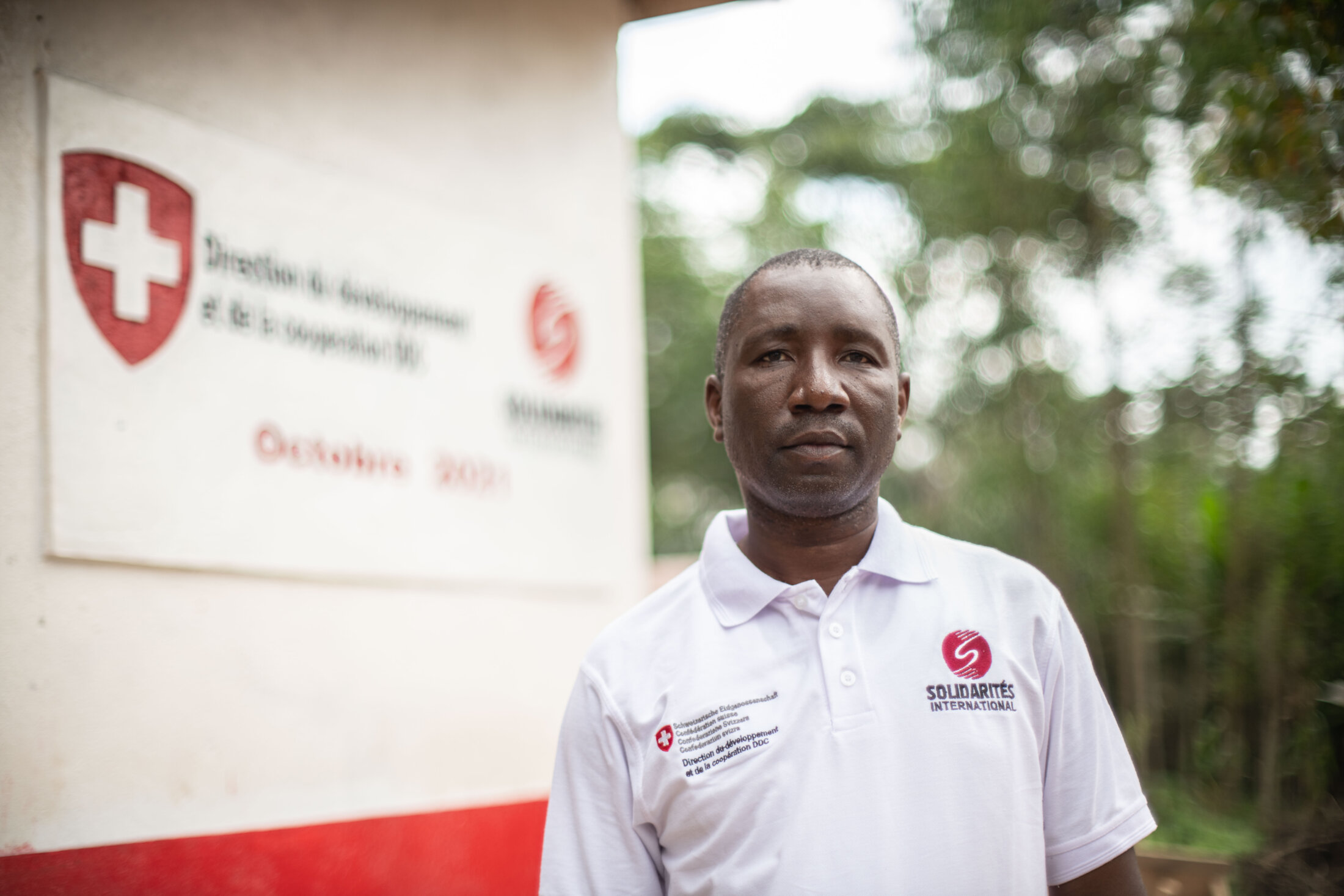 Ndungo est chef d’équipe « Eau, Assainissement et Hygiène » pour SOLIDARITÉS INTERNATIONAL. Il pose ici devant les blocs de latrines construits par l’association dans la zone de santé de Beni. Beni, République démocratique du Congo, décembre 2021.