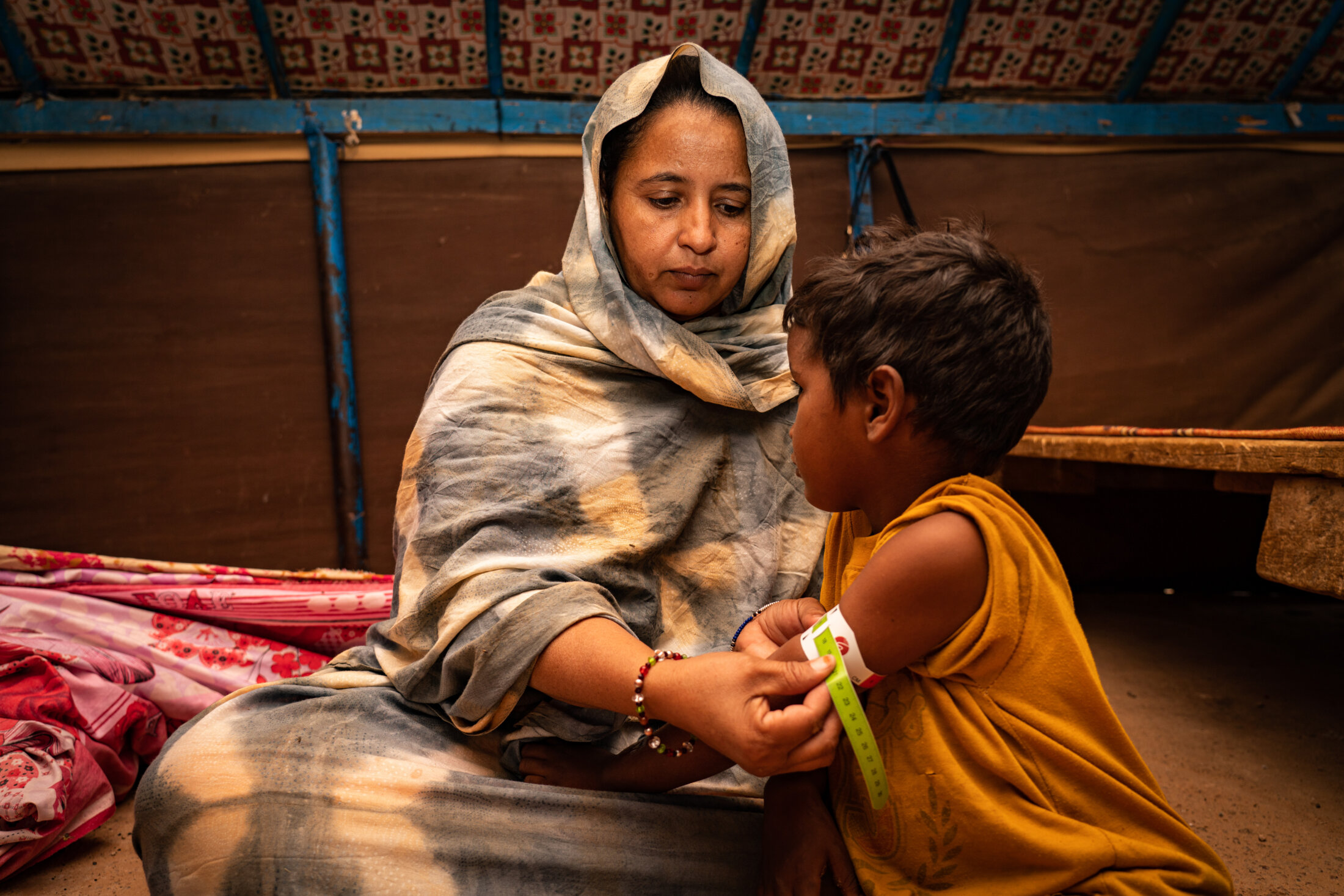 Depuis plusieurs années, les populations du cercle de Goundam, au Mali, font face à une crise multifactorielle majeure qui entraîne une forte insécurité alimentaire. SOLIDARITÉS INTERNATIONAL, avec le soutien financier de l'Office of U.S. Foreign Disaster Assistance (OFDA), a mené des campagnes de dépistage massif des cas de malnutrition et ainsi permis la prise en charge de nombreux enfants. La mesure du périmètre brachial est un des principaux outils utilisés afin de dépister les cas de malnutrition chez les enfants. Village de Darsalam, commune de Tilemsi dans le cercle de Goundam, Mali, décembre 2021.