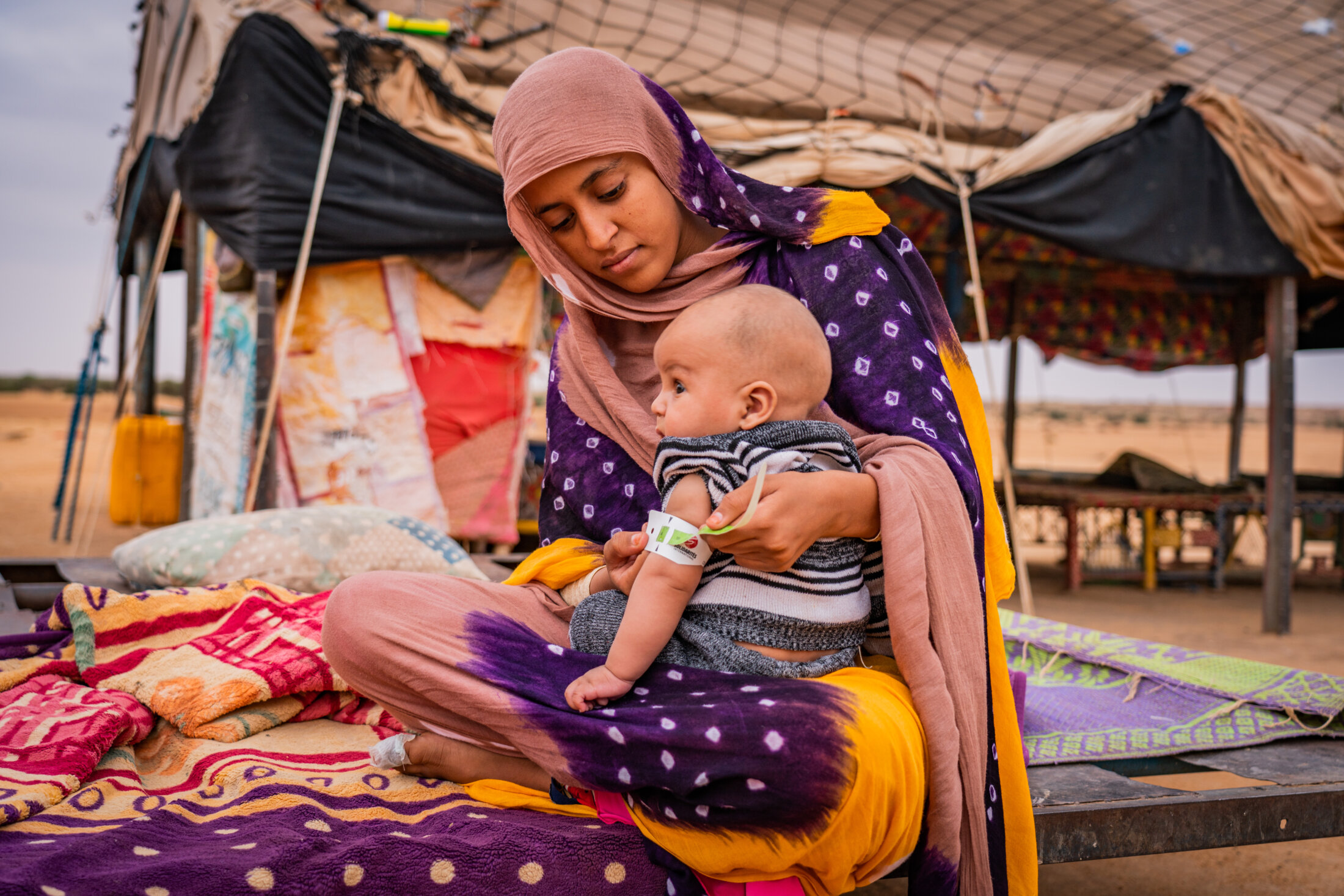 « La sensibilisation des relais et des agents de SOLIDARITÉS INTERNATIONAL m’a permis de comprendre les pratiques nutritionnelles, alimentaires et d’hygiène que je dois adopter pour mon enfant », explique Elbatour, 27 ans, en mesurant le périmètre brachial de son enfant Fadimata. Les équipes de SOLIDARITÉS INTERNATIONAL distribuent des kits aux mamans d’enfants malnutris permettant un meilleur dépistage de cette maladie et une meilleure prise en charge. Village de Lerneb, commune de Tilemsi dans le cercle de Goundam, Mali, décembre 2021.