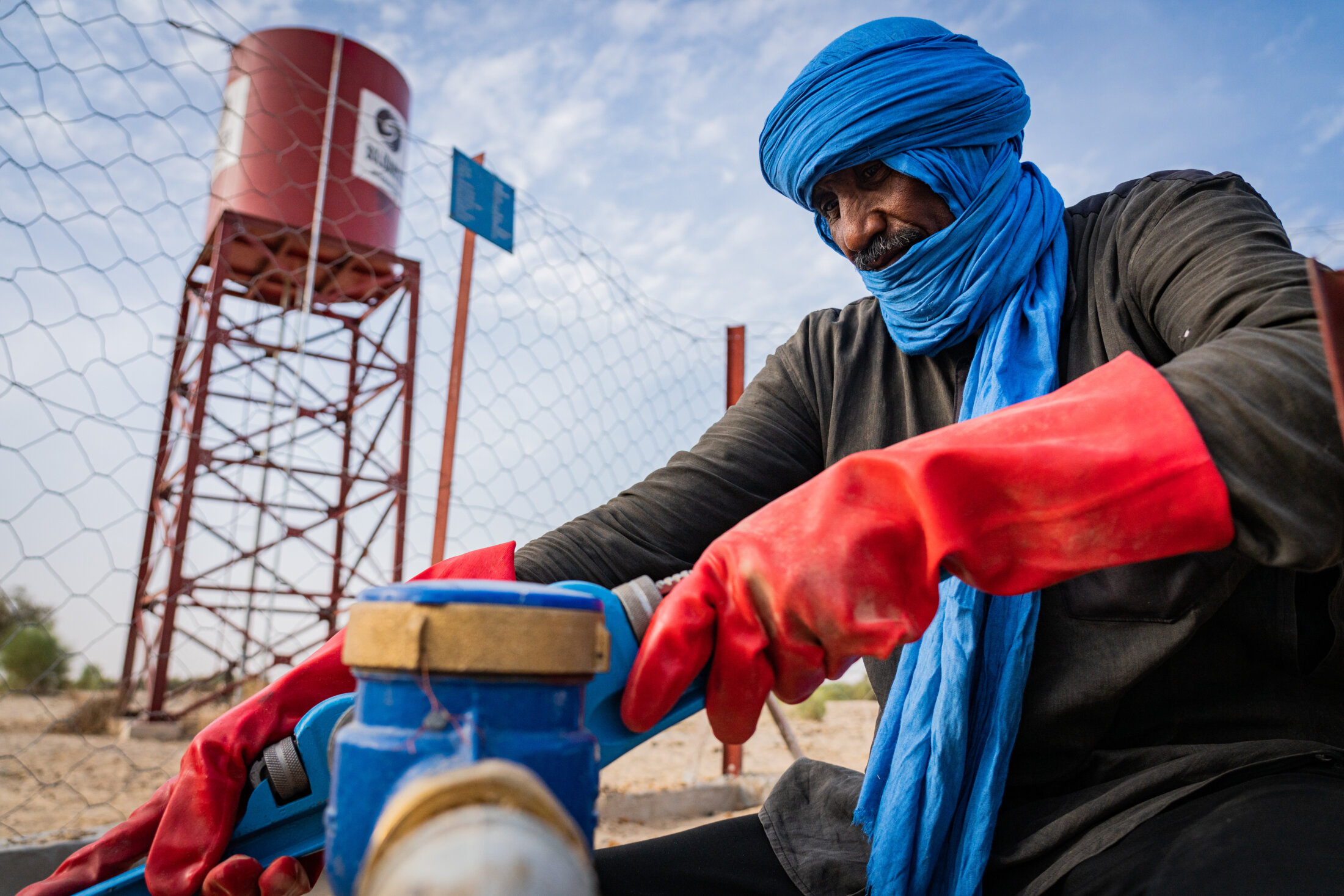« Il y a un adage qui dit « Donner de l’eau à quelqu’un qui a soif, c’est sauver sa vie ». SOLIDARITÉS INTERNATIONAL a sauvé nos vies car on avait beaucoup de problèmes en raison du manque d’eau […]. SOLIDARITÉS INTERNATIONAL nous a également formés pour que nous puissions assurer la bonne gestion et la maintenance du point d’eau. Aujourd’hui, s’il y a des pannes, je peux moi-même les réparer grâce à la formation et aux outils que j’ai reçus », raconte Ahmedou, maintenancier du comité de gestion du point d’eau. Village de Tinachararatane, commune de Tin-Aïcha dans le cercle de Goundam, Mali, décembre 2021.