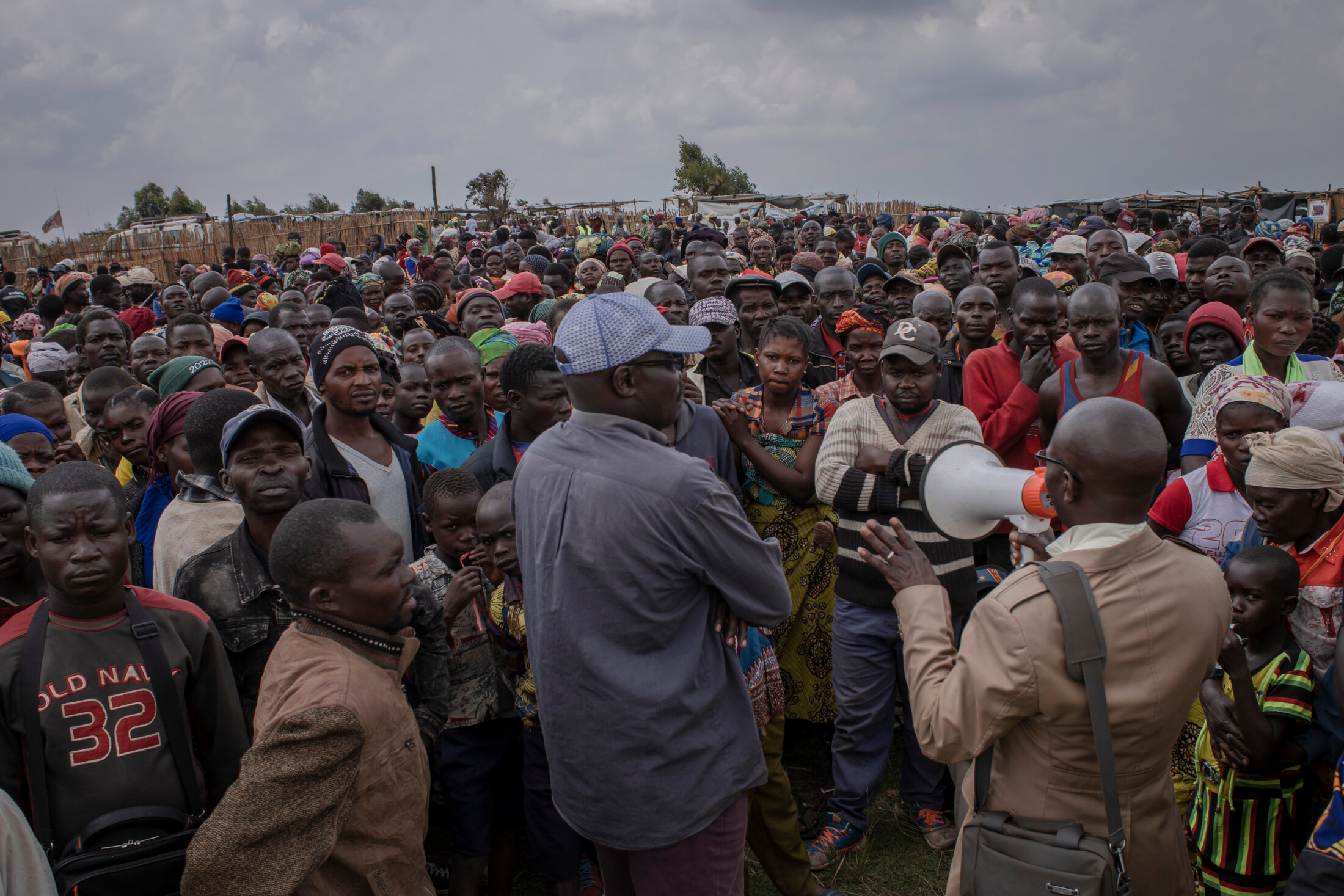 Les équipes de l’ONG SOLIDARITÉS INTERNATIONAL vérifient les informations des participants avant le lancement de la foire alimentaire. Une grande partie d’entre eux sont des personnes qui ont fui les combats pendant un temps mais qui ont décidé de revenir dans leur village. Village de Godjoka, district de Djugu, dans la province de l’Ituri, République démocratique du Congo, décembre 2022.