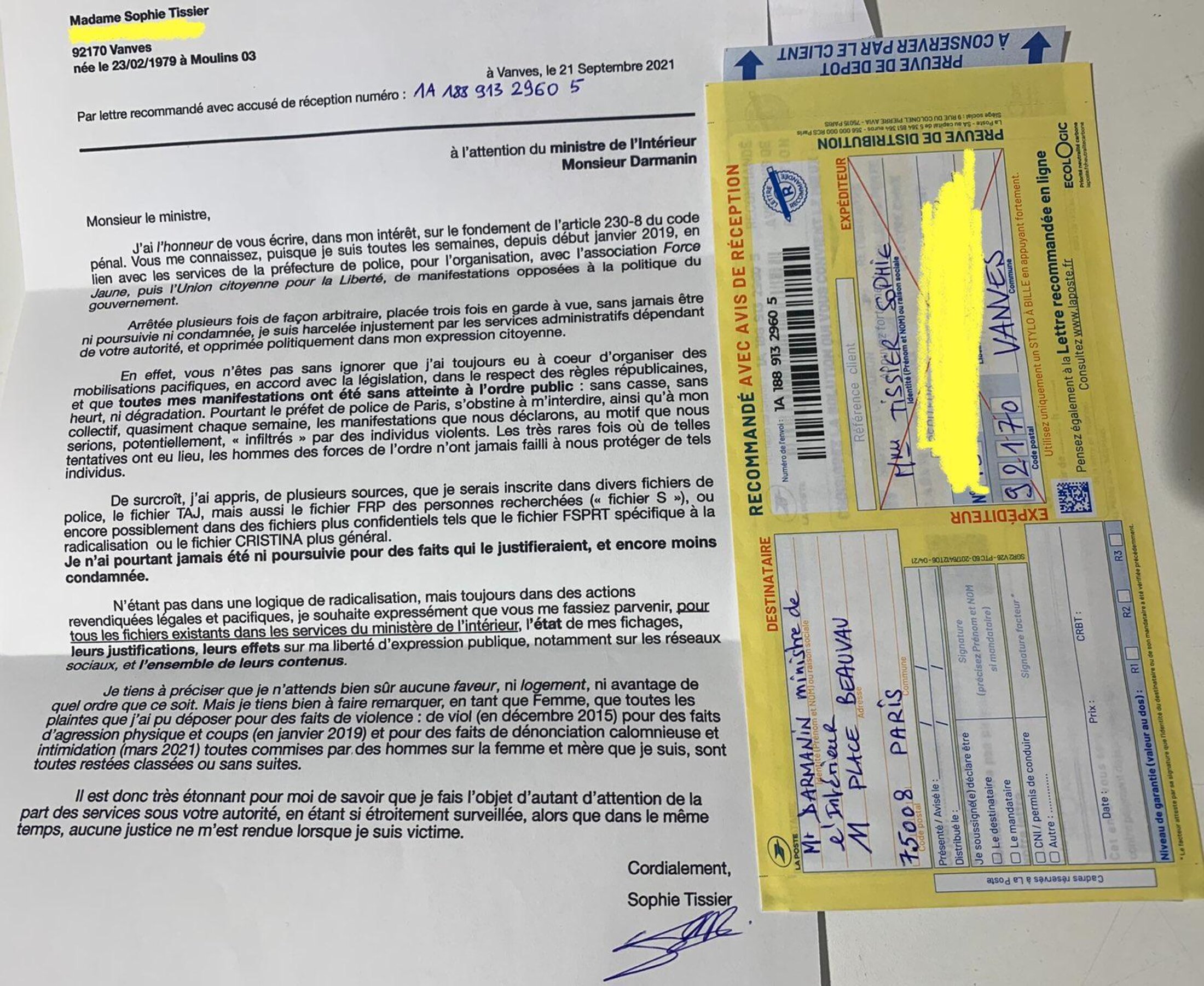 N’étant pas dans une logique de radicalisation, mais toujours dans des actions revendiquées légales et pacifiques, je souhaite expressément que vous me fassiez parvenir, pour tous les fichiers existants dans les services du ministère de l’intérieur, l’état de mes fichages, leurs justifications, leurs effets sur ma liberté d’expression publique, notamment sur les réseaux sociaux, et l’ensemble de leurs contenus.