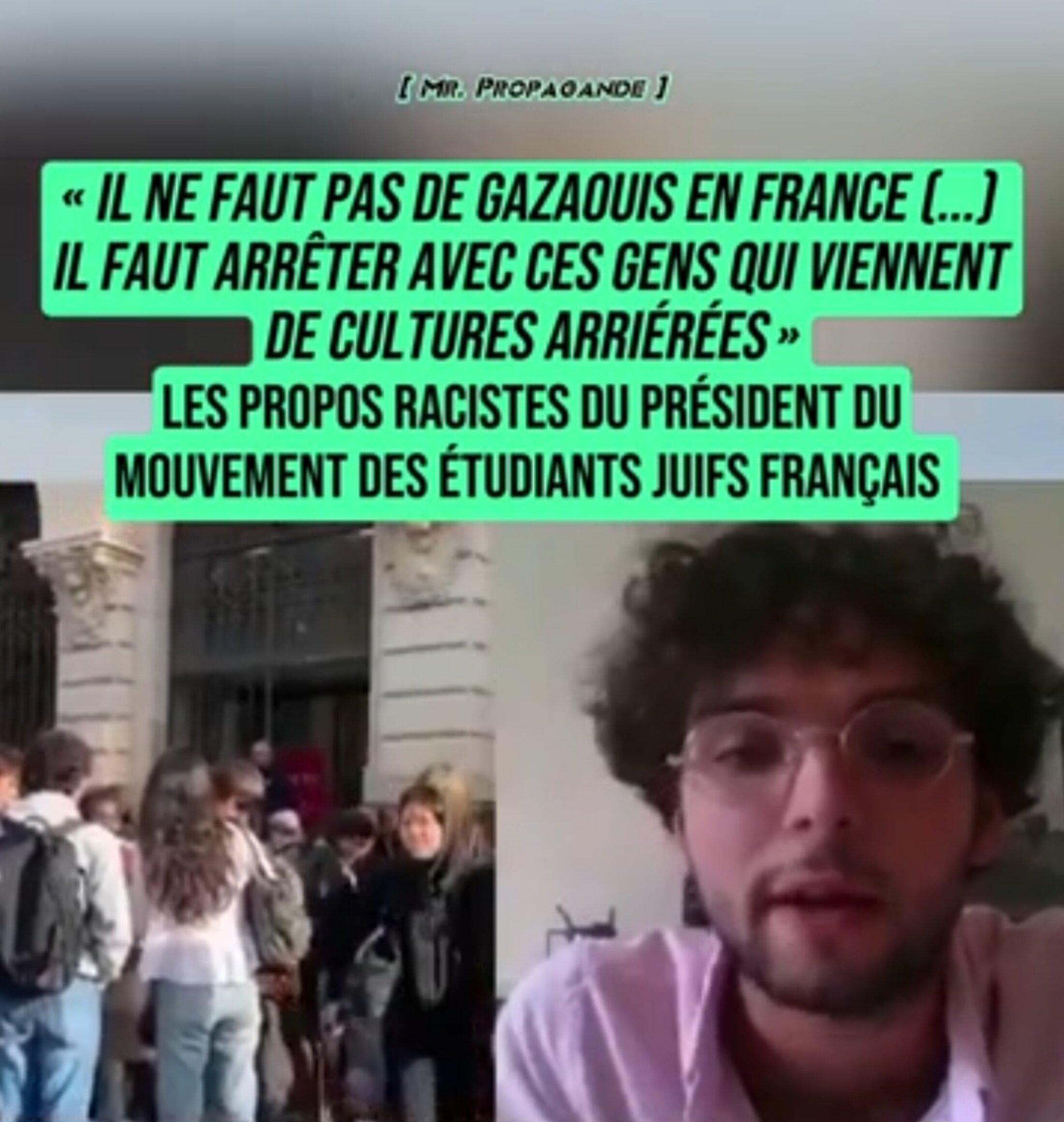 Sur les réseaux, des Israéliens s'affichent en criant "mort aux arabes" ou "il faut vider Gaza des arabes", les dirigeants occidentaux ont permis cette impunité. Sur BFM on a droit à un reportage entier sur des colons israéliens marchant vers Gaza et tenant des propos xénophobes le tout saupoudré d'apologies de crimes contre l'humanité. BFMTV n'apporte aucune contradiction, aucune analyse politique ou juridique. Une chaîne d'information se doit d'être factuelle et D'INFORMER qu'il s'agit ici, conformément au droit international, d'apologies de crimes contre l'humanité. Sur Cnews, Aurélien Bernheim, Président du Mouvement des Éudiants Juifs Français déclare : « Il ne faut pas de gazaouis en France (...) Il faut arrêter avec ces gens qui viennent de cultures arriérées (...) Emmanuel Macron est le président le plus hostile au peuple juif revenu sur sa terre ». Et là je m'adresse à toi Aurélien : cesse d'instrumentaliser les personnes de confession pour justifier ton racisme, ta xénophobie, ton suprémacisme. Le 1er août Jean Noël Barrot, Ministre des Affaires étrangères, annonçait que La France n’accueillerait plus de Gazaouis évacués avant la fin d’une enquête sur les publications antisémites d’une étudiante à Lille. Premièrement : condamner des milliers de personnes Palestiniennes – possiblement à mort — pour les propos d'une personne c'est : une stigmatisation, une discrimination, de la xénophobie. Deuxièmement, ceci n'est qu'un prétexte pour satisfaire les exigences d'Israël et masquer la complicité de l'État français dans le génocide.