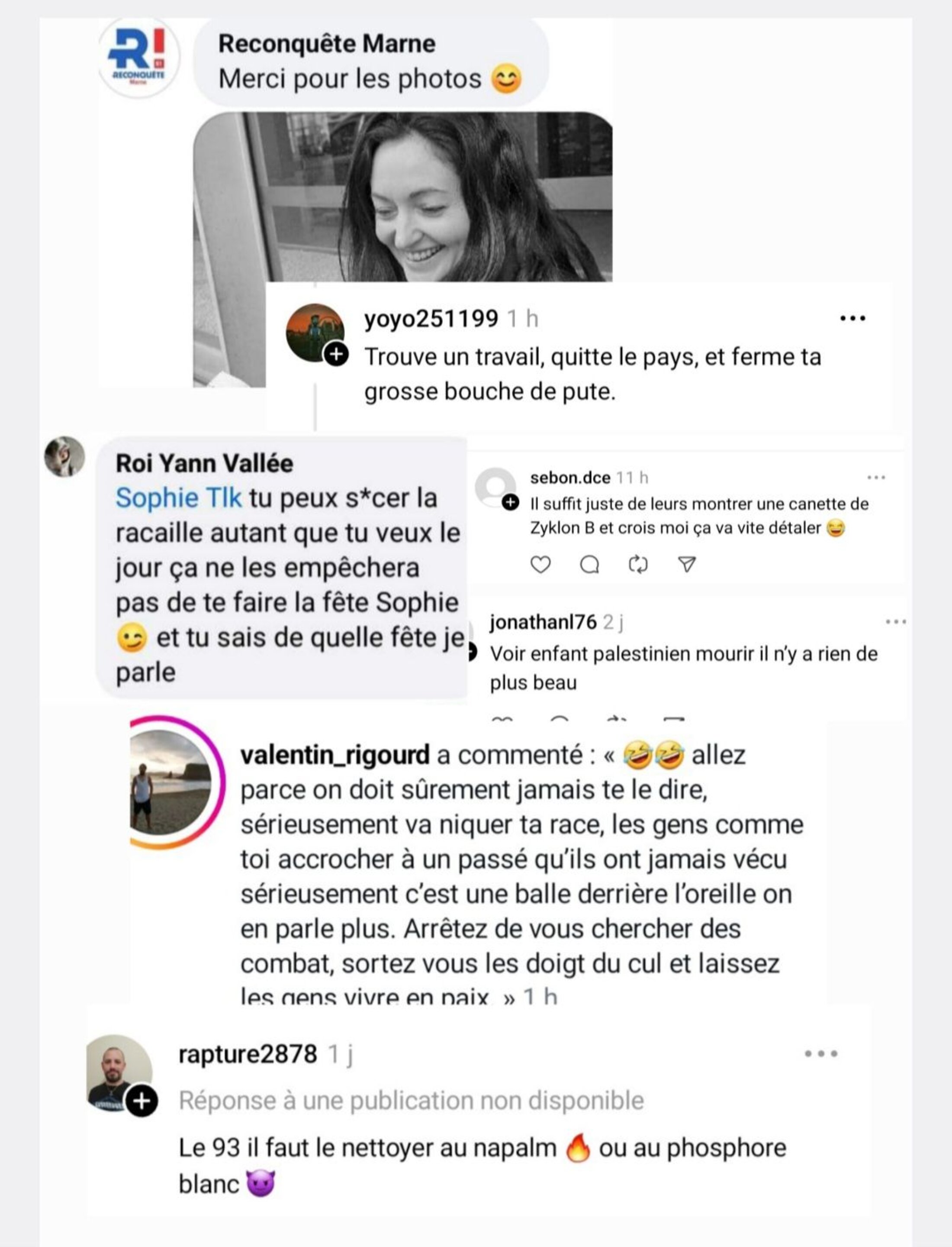 Oui, parce que j'avais écrit sur les crimes racistes et coloniaux de la France, c'était impardonnable, d'après Valentin Rigourd, ça meritait donc un trou dans ma tête comme il me l'écrivit sur Instagram. Mais ce n'était pas la première fois que je faisais face à cette armée de racistes, de mascu, de trolls. Quand ce n'est pas l'incitation au viol, ce sont des membres de Reconquête qui viennent en commentaire me dire qu'ils ont des photos de moi (bravo les sherlocks, vous savez télécharger une photo). Bref, sur les réseaux j'ai été assassinée plusieurs fois.