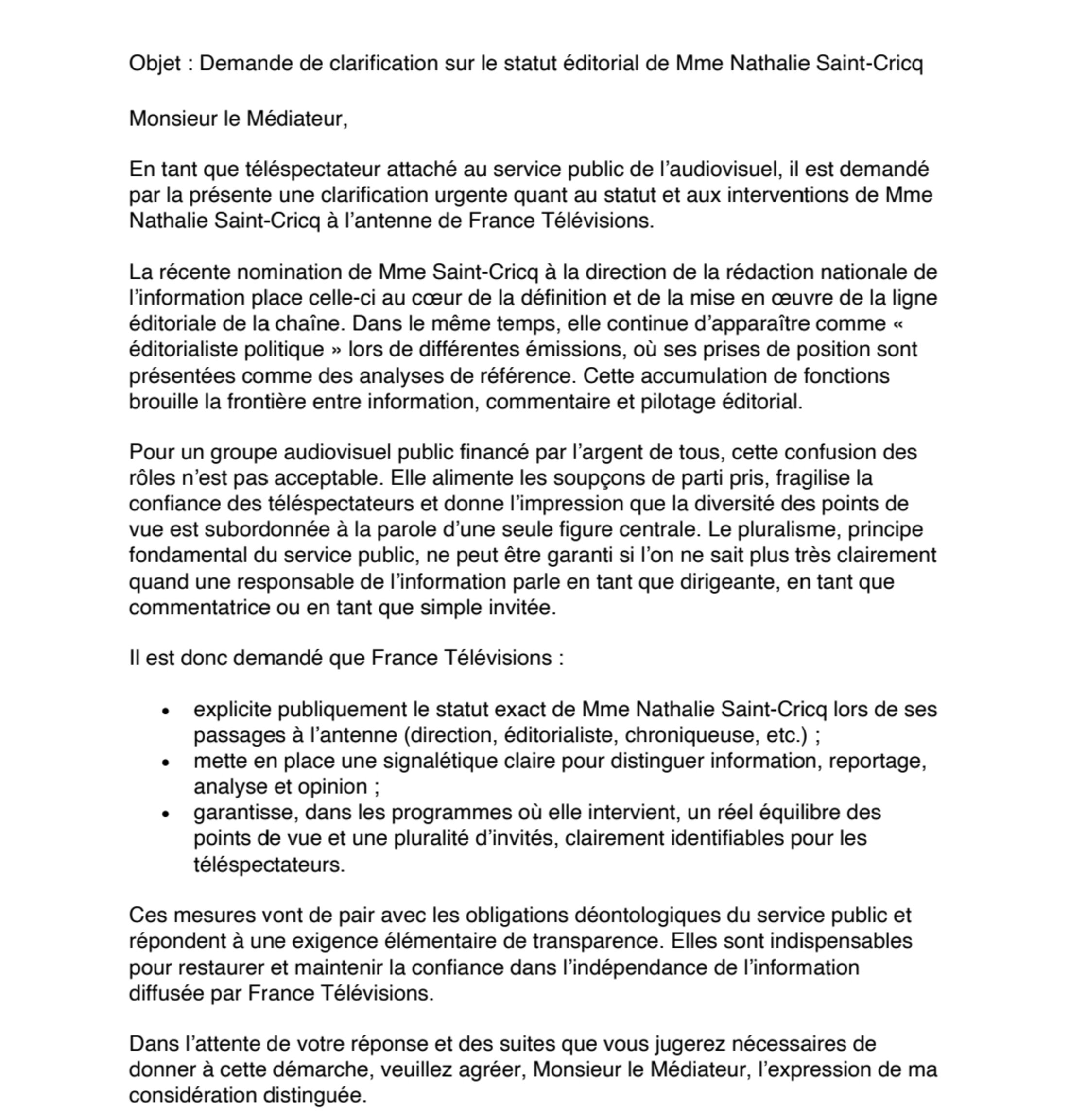 Nathalie Saint-Cricq à l’antenne. En effet : « la récente nomination de Mme Saint-Cricq à la direction de la rédaction nationale de l’information place celle-ci au cœur de la définition et de la mise en œuvre de la ligne éditoriale de la chaîne. Dans le même temps, elle continue d’apparaître comme "éditorialiste politique" lors de différentes émissions, où ses prises de position sont présentées comme des analyses de référence. Cette accumulation de fonctions brouille la frontière entre information, commentaire et pilotage éditorial. Pour un groupe audiovisuel public financé par l’argent de tous, cette confusion des rôles n’est pas acceptable. Elle alimente les soupçons de parti pris, fragilise la confiance des téléspectateurs et donne l’impression que la diversité des points de vue est subordonnée à la parole d’une seule figure centrale. Le pluralisme, principe fondamental du service public, ne peut être garanti si l’on ne sait plus très clairement quand une responsable de l’information parle en tant que dirigeante, en tant que commentatrice ou en tant que simple invitée.» Voici la lettre dans son intégralité :