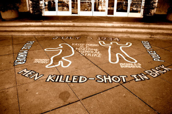 A San Francisco, le trottoir devant cette salle publique rappelle le martyr de deux grévistes en 1934, tués froidement par la police par des tirs dans le dos. 82 ans après, les contours et inscriptions sont entretenus pour entretenir la mémoire des luttes et des souffrances de la classe ouvrière.