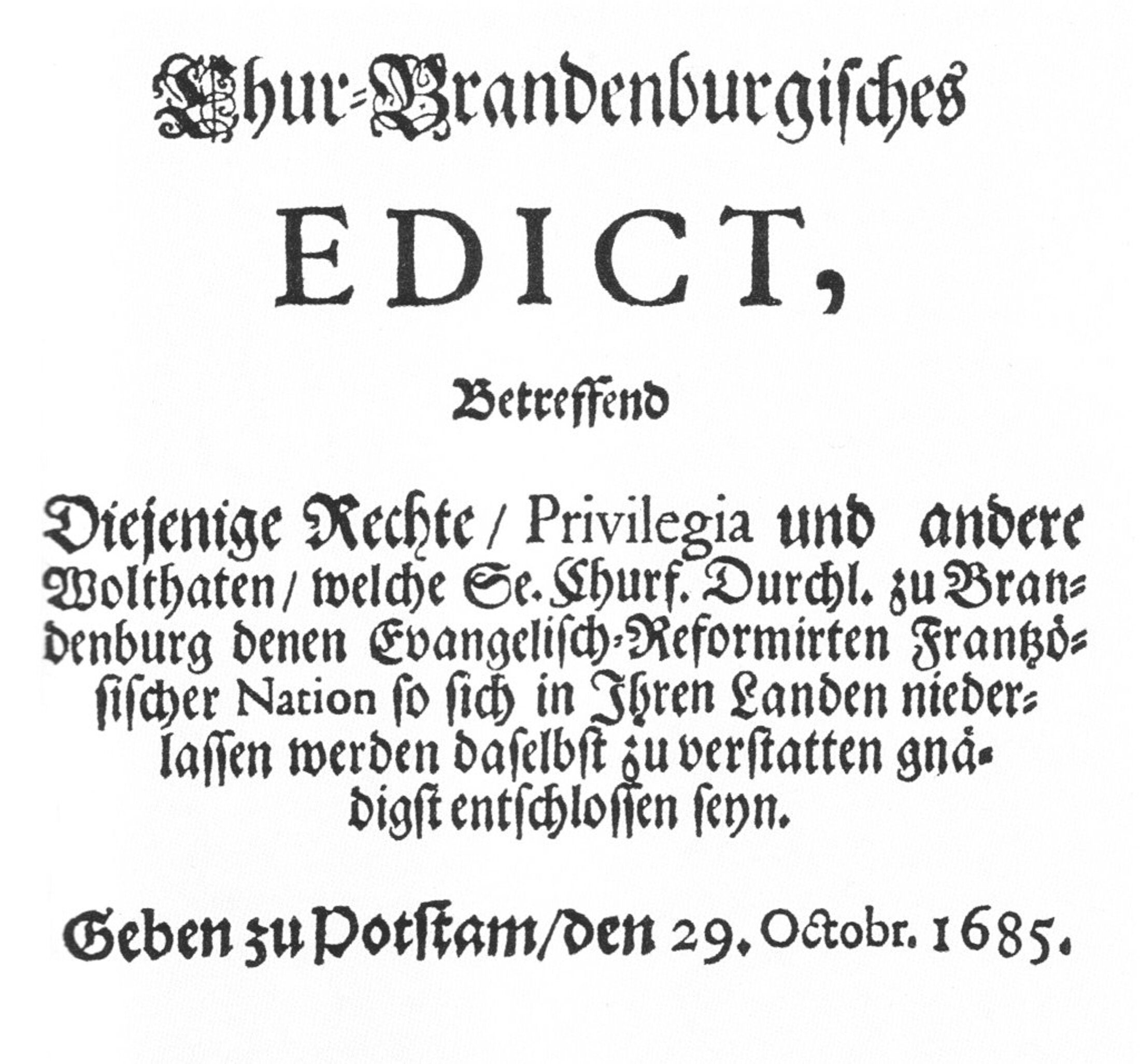 A partir de la révocation de cet Edit, les protestants, bien que souvent les plus « dégourdis » de l'époque et les plus créatifs et laborieux, furent plus que menacés sur le sol français. Que fit alors le Duc de Prusse ? Il flaira un bon coup et il réussit même à en faire, avec une seul pierre, plusieurs. Il avait besoin de repeupler certaines zones, de reconstituer et renforcer ses élites et, « en même temps », d'affaiblir la France. Ainsi, par l’Édit de Potsdam du 29 Octobre 1685 (soit seulement quelques jours après la révocation de l’Édit de Nantes), il profita des persécutions pour accueillir les réfugiés protestants français sur le territoire prussien et brandebourgeois. Au delà d’un "visa", ce fut un « pont d'or » : les réfugiés se virent offrir quatre ans d'exemption d'impôt, du bois de construction, des terrains et même la liberté de suivre leur culte en français et de conserver le droit français et leurs propres magistrats. Cette ouverture des frontières favorisa également la venue des protestants persécutés de Russie ou de Bohême. Potsdam fut ainsi transformé en une "plaque tournante" de l’immigration européenne. De 140 000 à 200 000 protestants quittèrent alors la France durant les deux décennies suivantes (soit 10 % des Protestants français et un peu moins d'1 % de la population du Royaume de France). Et, 200 ans plus tard en 1870, devinez quelle était l'origine de nombreux scientifiques, industriels et surtout de dizaines de hauts officiers de l'Armée Prussienne qui nous a mis la pâté ? Ben... c'étaient des descendants de Protestants français...