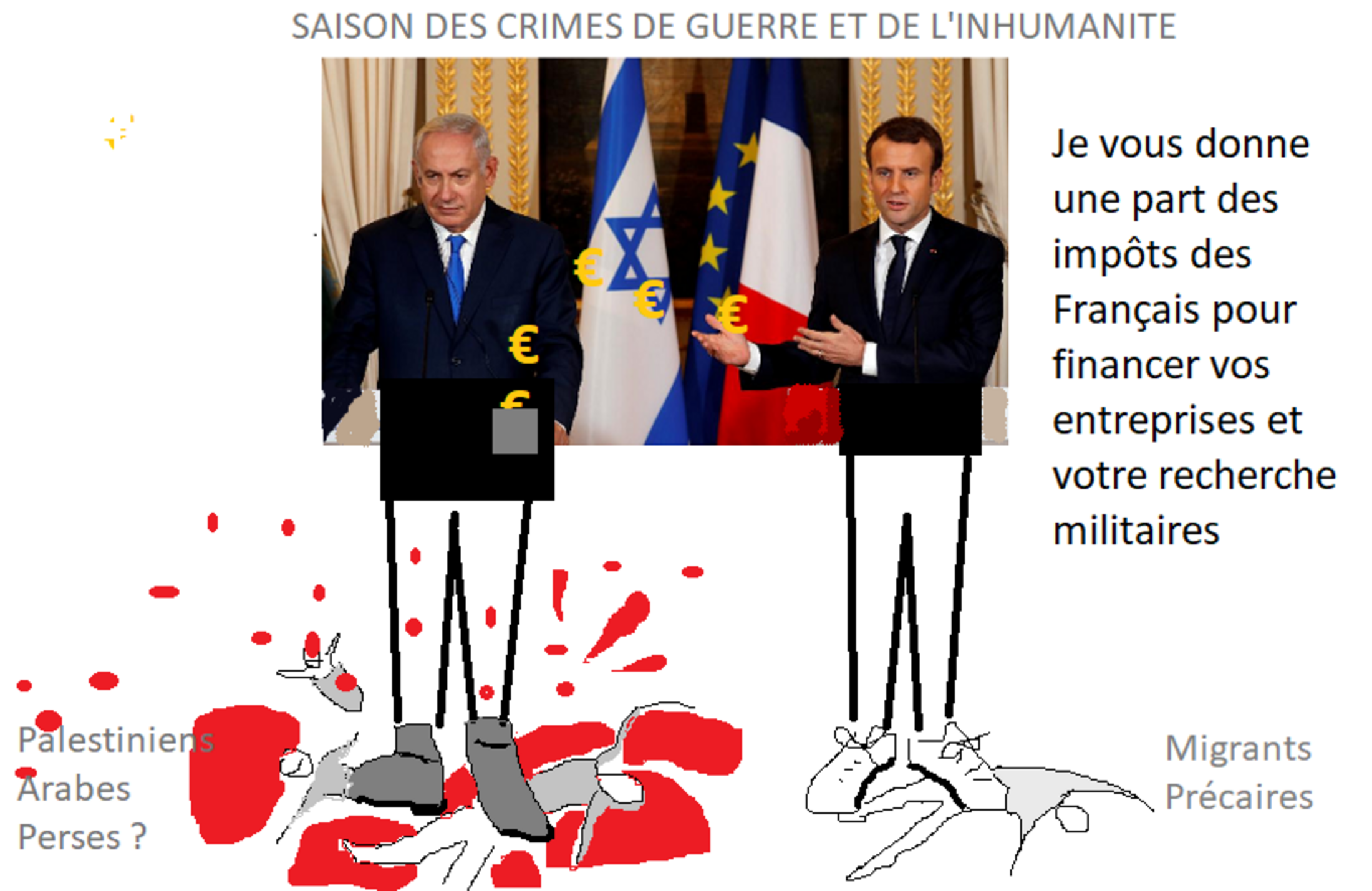 Il s'exprime ainsi dans la brochure de présentation de l’événement la "Saison France -Israël". Comme si les tirs de snipers sur des manifestants pacifistes et les bombardements relevaient de simples « turbulences » sans responsable. Et d’ajouter : « Il en va ainsi de l’amitié entre Israël et la France » muée en inclination pour son premier ministre. Le locataire de l’Élysée va même jusqu’à affirmer : « Elle est un point fixe et assuré dans un monde en mouvement, une constante de notre identité », évoquant une « osmose sur bien des thèmes » entre les deux pays. À condition, probablement, d’omettre le respect des droits humains et du droit international.