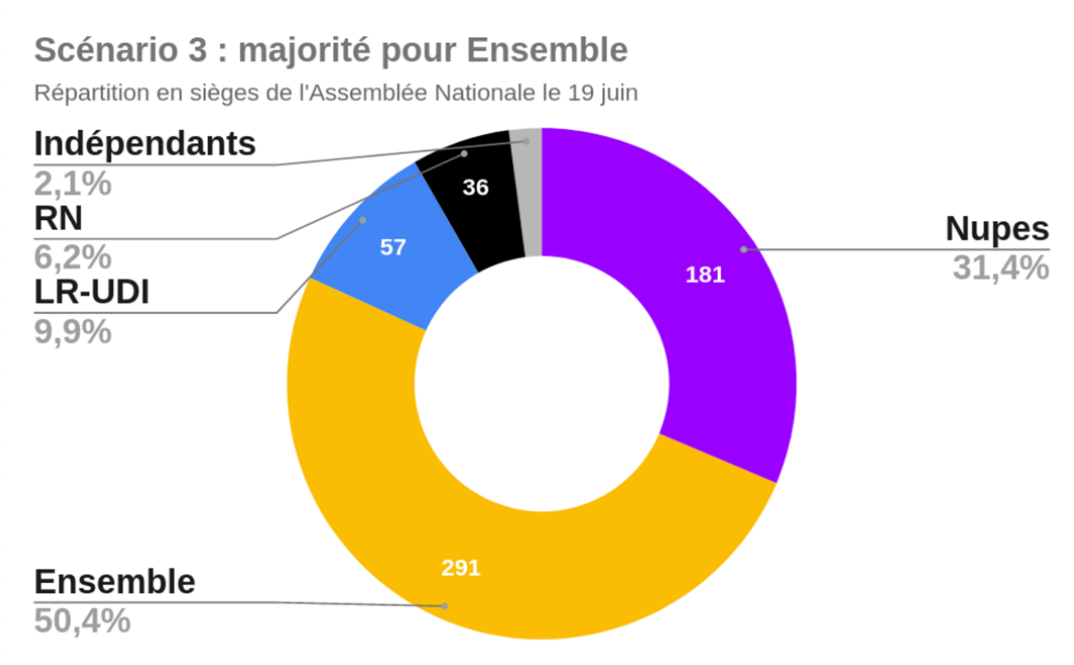 Les différents scénarios envisageables tournent donc autour de la probabilité de gain lors des 282 duels NUPES / Ensemble. C'est là que va se jouer la majorité tant pour la NUPES que pour la majorité actuelle.