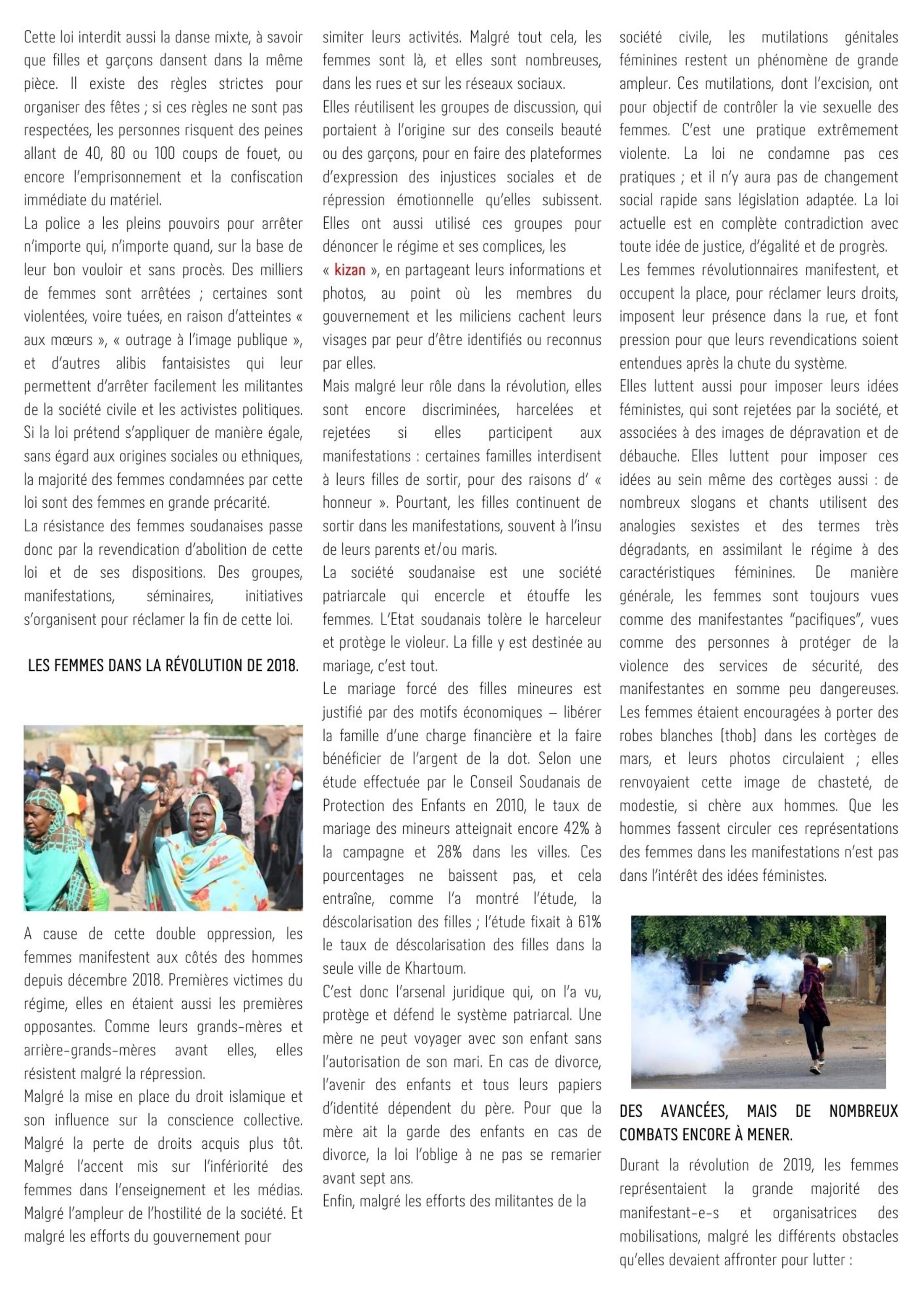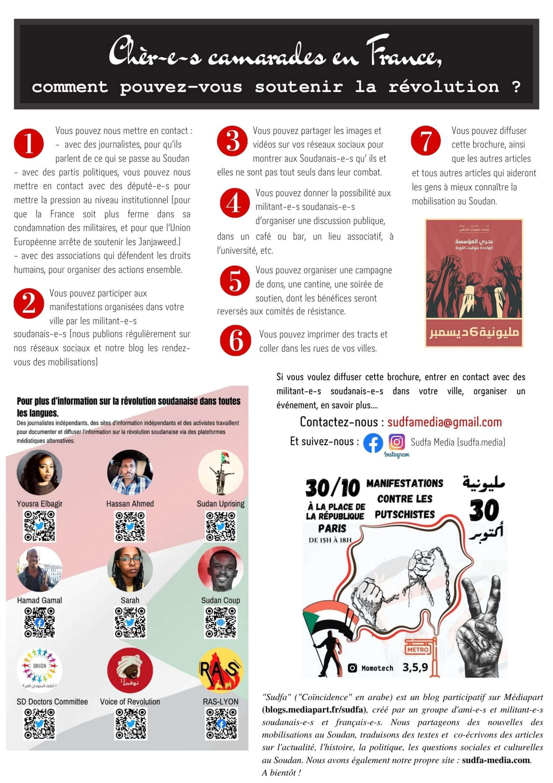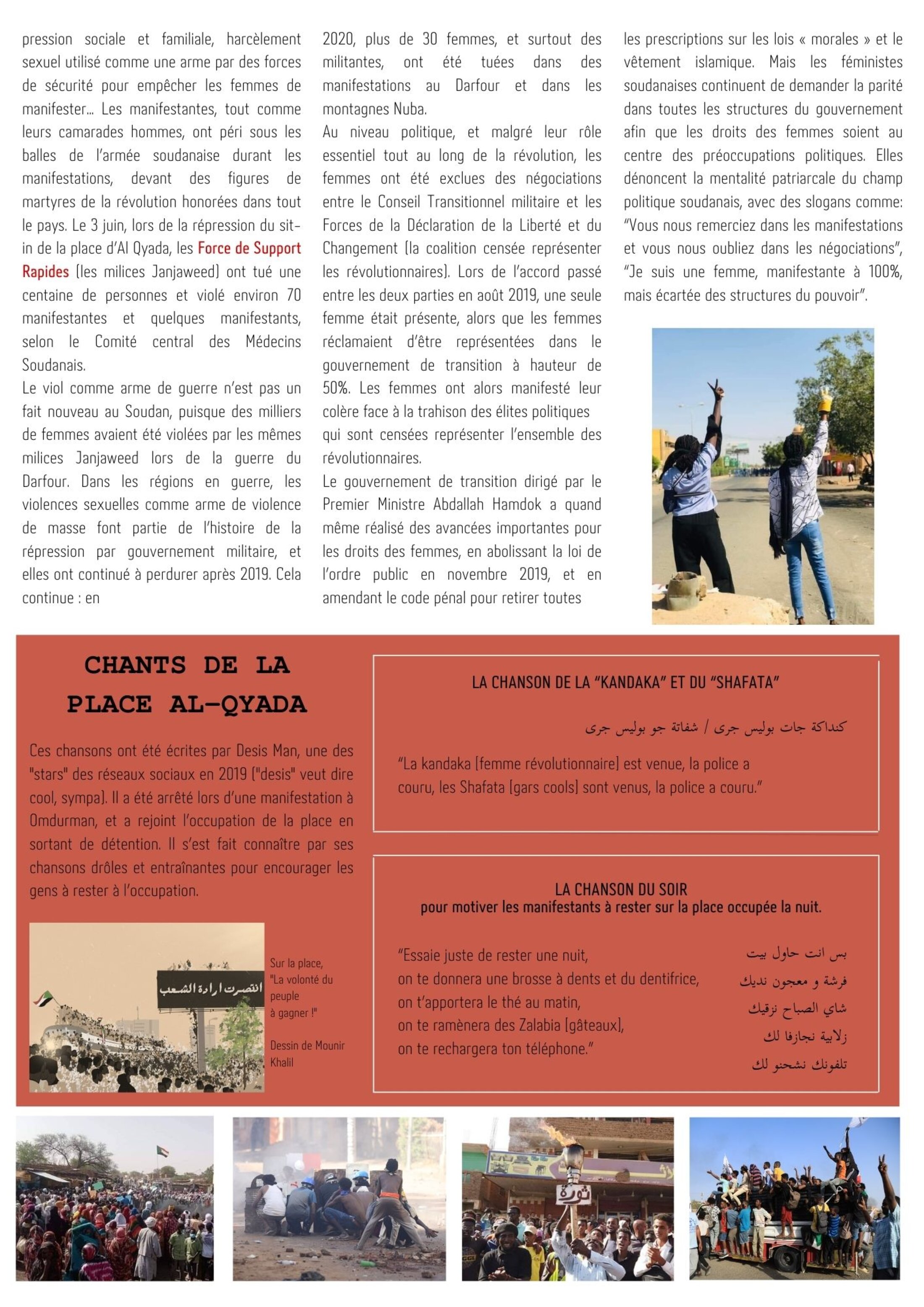 La brochure papier "Sudfa", c'est quoi ? - Un outil pédagogique pour comprendre rapidement les enjeux politiques et sociaux qui traversent le Soudan aujourd'hui - Une manière de s'instruire et d'instruire ses proches sur les luttes menées au Soudan depuis 2018 - De belles images des manifestations au Soudan prises par les photographes militants soudanais - Des traductions de slogans, de chansons... qui permettent de mieux découvrir la culture Soudanaise