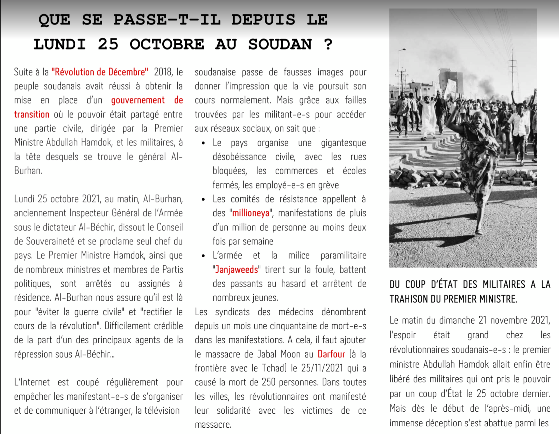 A l'heure où le peuple soudanais a de nouveau pris les rues pour réclamer la chute des militaires (le général Burhan qui a pris le pouvoir par un coup d'état en octobre), notre petite équipe franco-soudanaise s'est activée pour vous proposer un tout premier numéro papier de nos articles, un premier numéro intitulé "Le retour en arrière, pas question - échos de la révolution soudanaise". Pour lire tous nos articles d'actualités et d'analyses, suivez notre blog Mediapart, ou notre site internet.