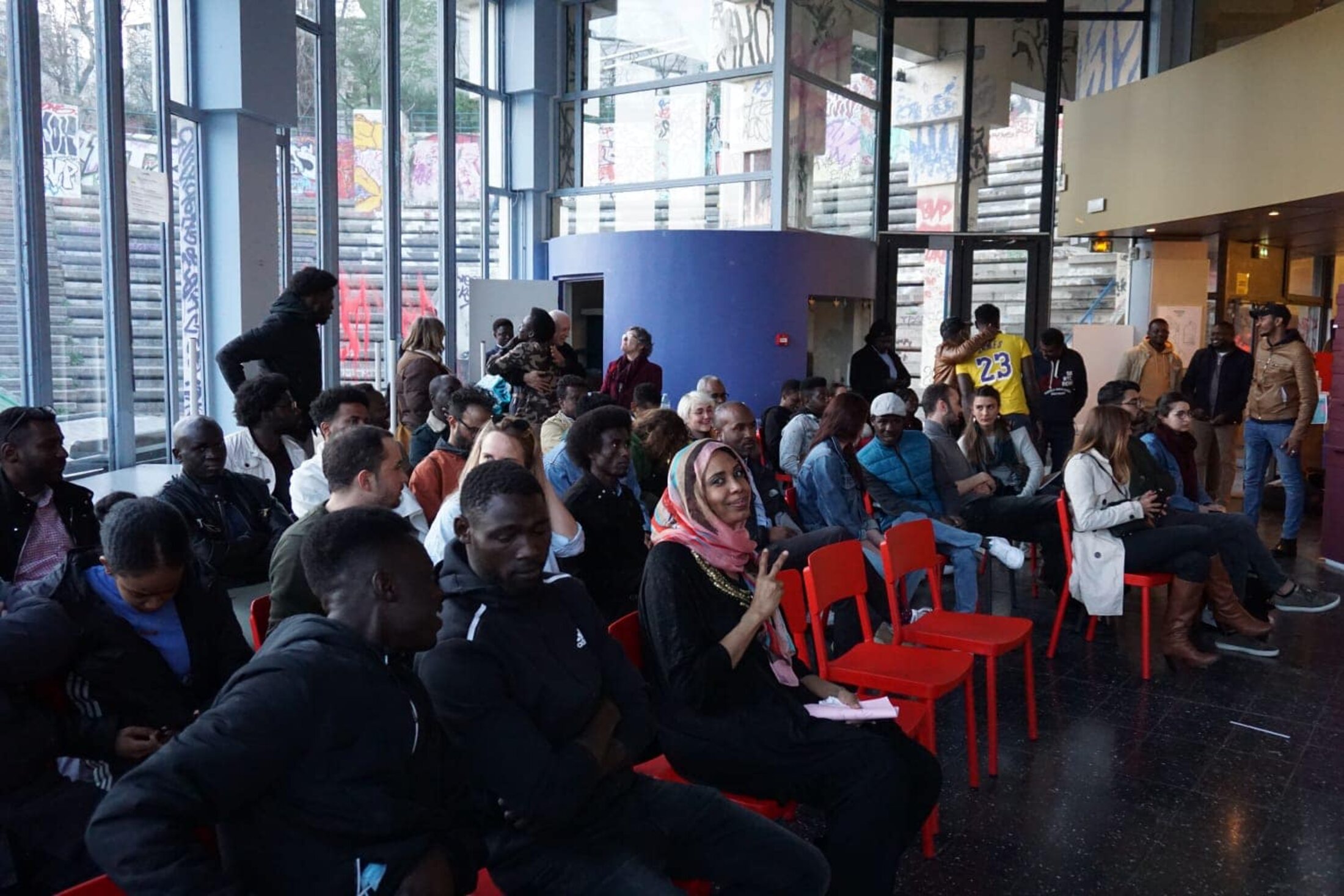 Ce lieu est une ambassade, c’est une arme et un outil. C’est l’ambassade des immigrées. Une ambassade de paix dans un monde en guerre. C’est l’ambassade de celles et ceux à qui on répète qu’ils sont étrangers, celle depuis laquelle nous préparons nos victoires collectives, celle depuis laquelle nous obtiendrons l’égalité de toutes et tous. »